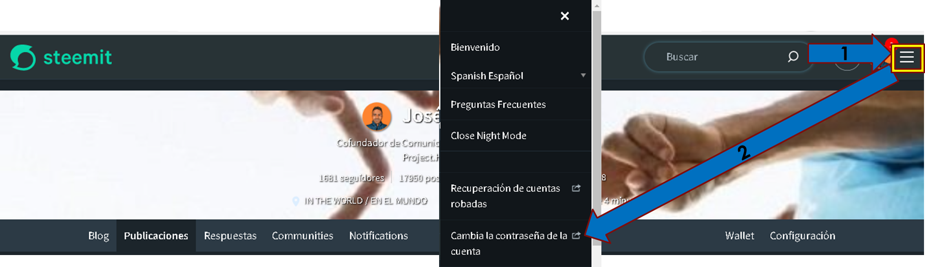 Para hacer cambio de las claves de mi cuenta lo realicé desde mi propio blog. Como pueden ver en la siguiente imagen van al extremo superior derecho de su blog, y ahí, al lado de donde está su imagen de perfil, encontrarán tres líneas horizontales, a las que dará clic 1, y se abrirá una pestaña de opciones, donde podrán ver que está la opción de Cambiar la Contraseña de la cuenta.2, obviamente, clic ahí😉.