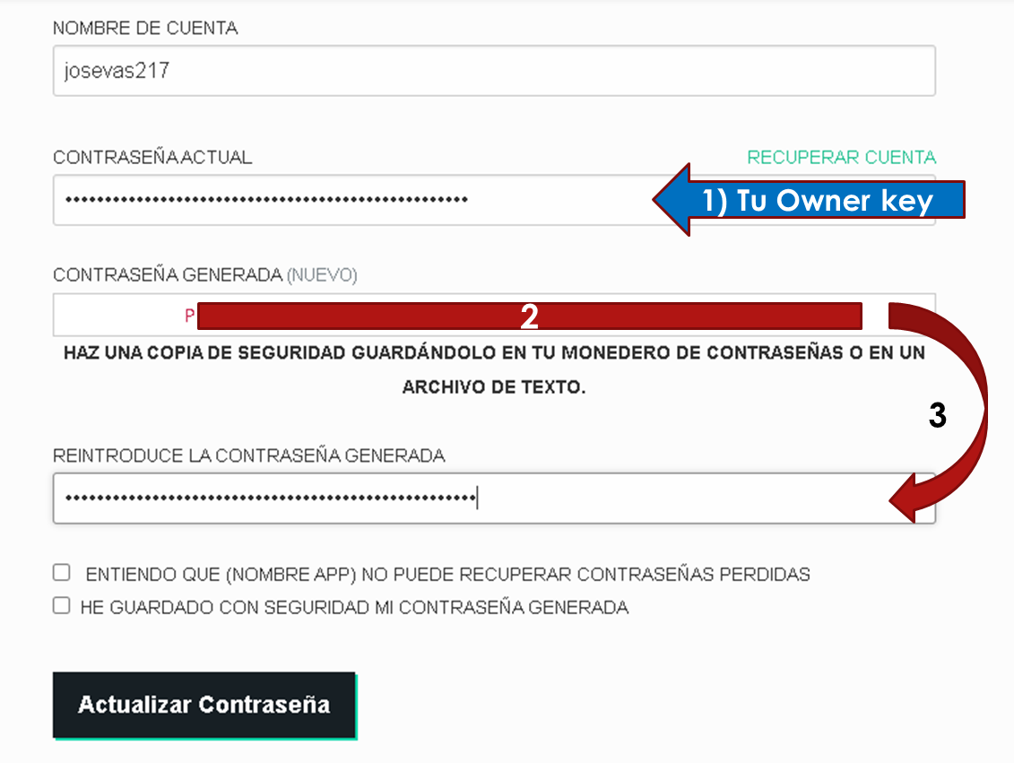 - Colocas el nombre de tu cuenta, posteriormente debes usar tu Owner Key, para poder cambiar todas las claves. Esto destaca aún más el porque no debes compartir tus claves, porque este cambio sólo lo puedes realizar usando esta clave...