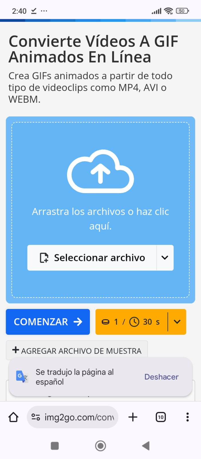 - Seleccione "archivo" para cargar el video. Cuando finalmente se cargo le dí "Comenzar" para que así se tranformara el Gif.