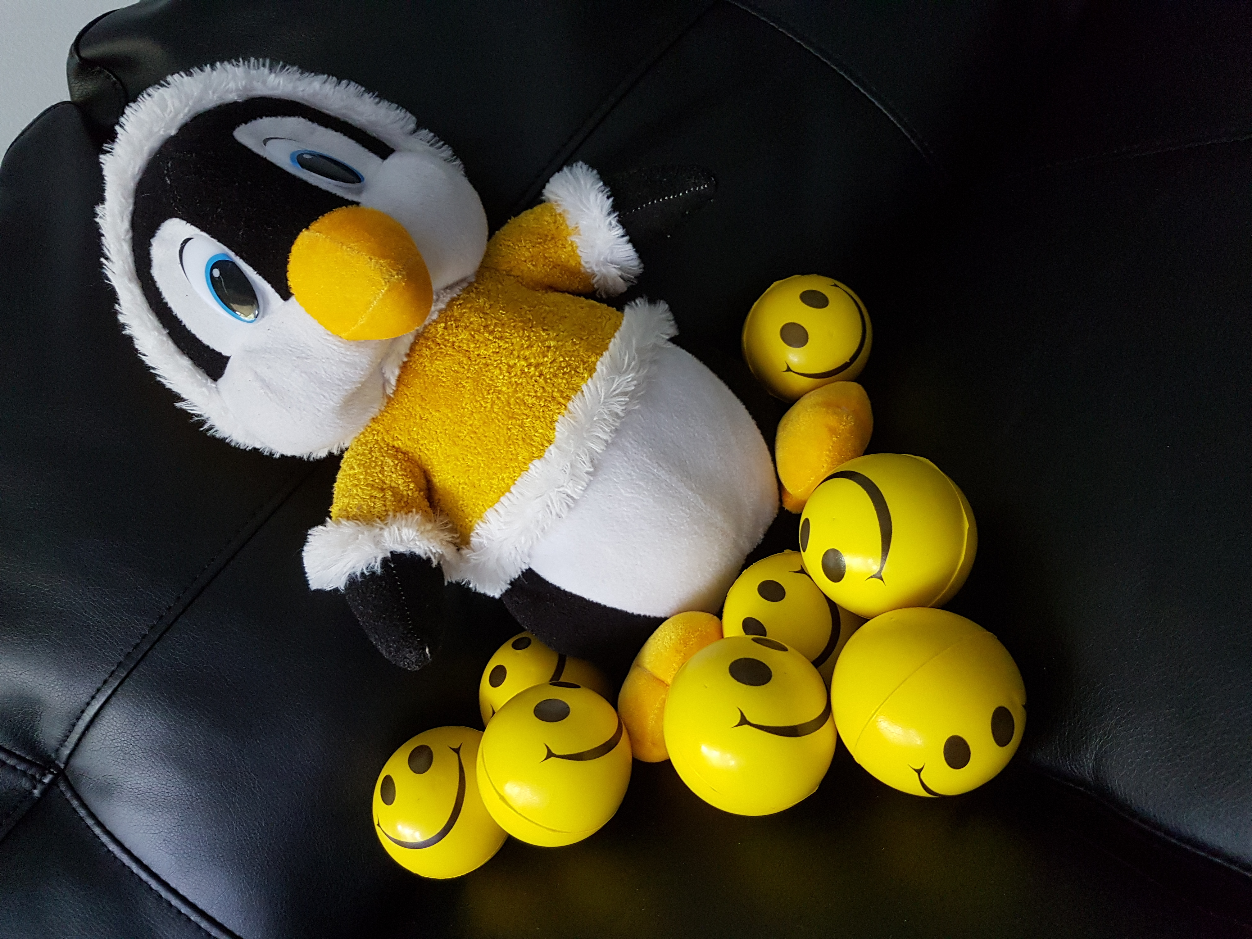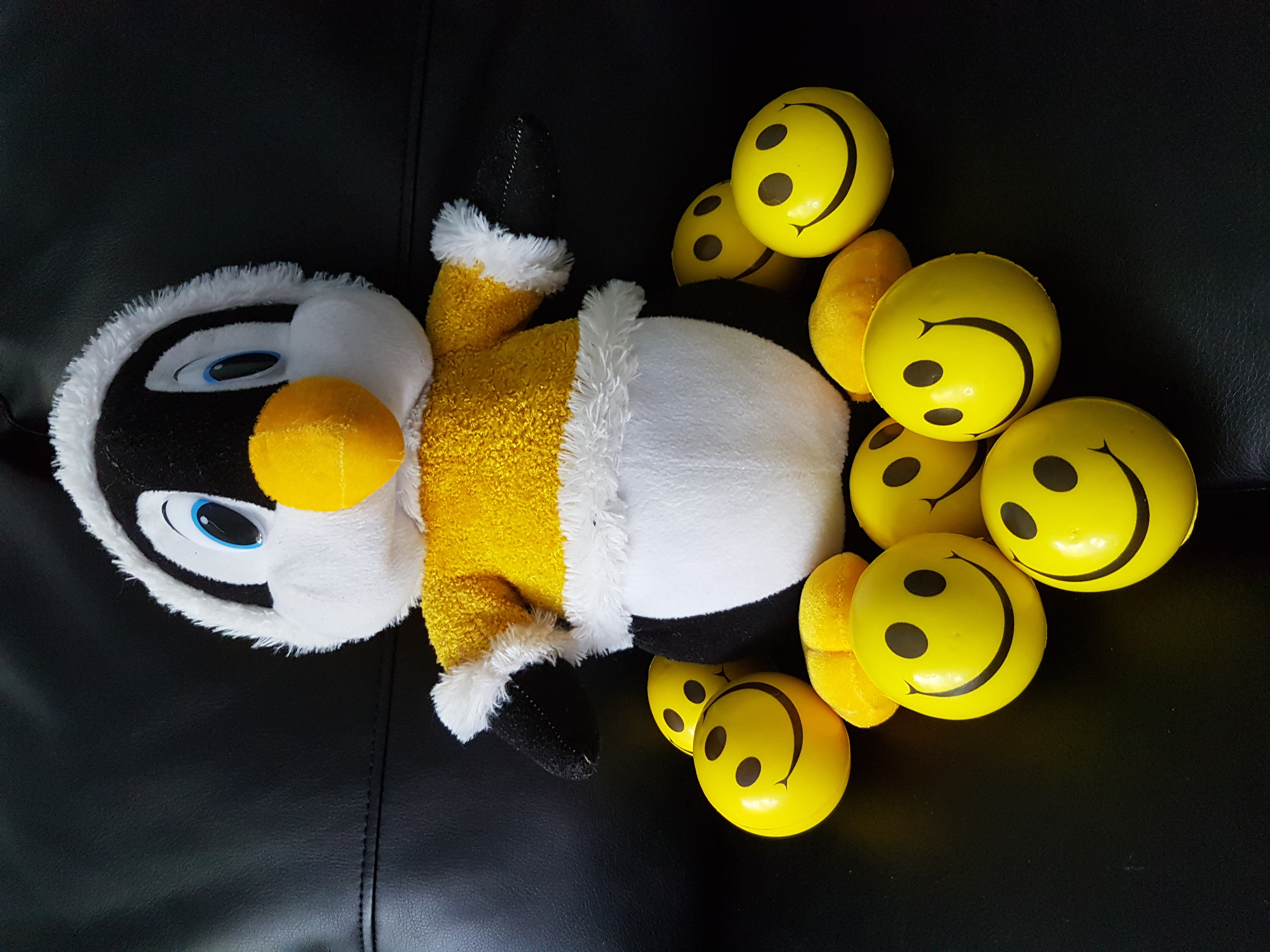 Its my daughter's soft toy that she won during her visit to PNE a few years back. A penguin playing with smiley balls.