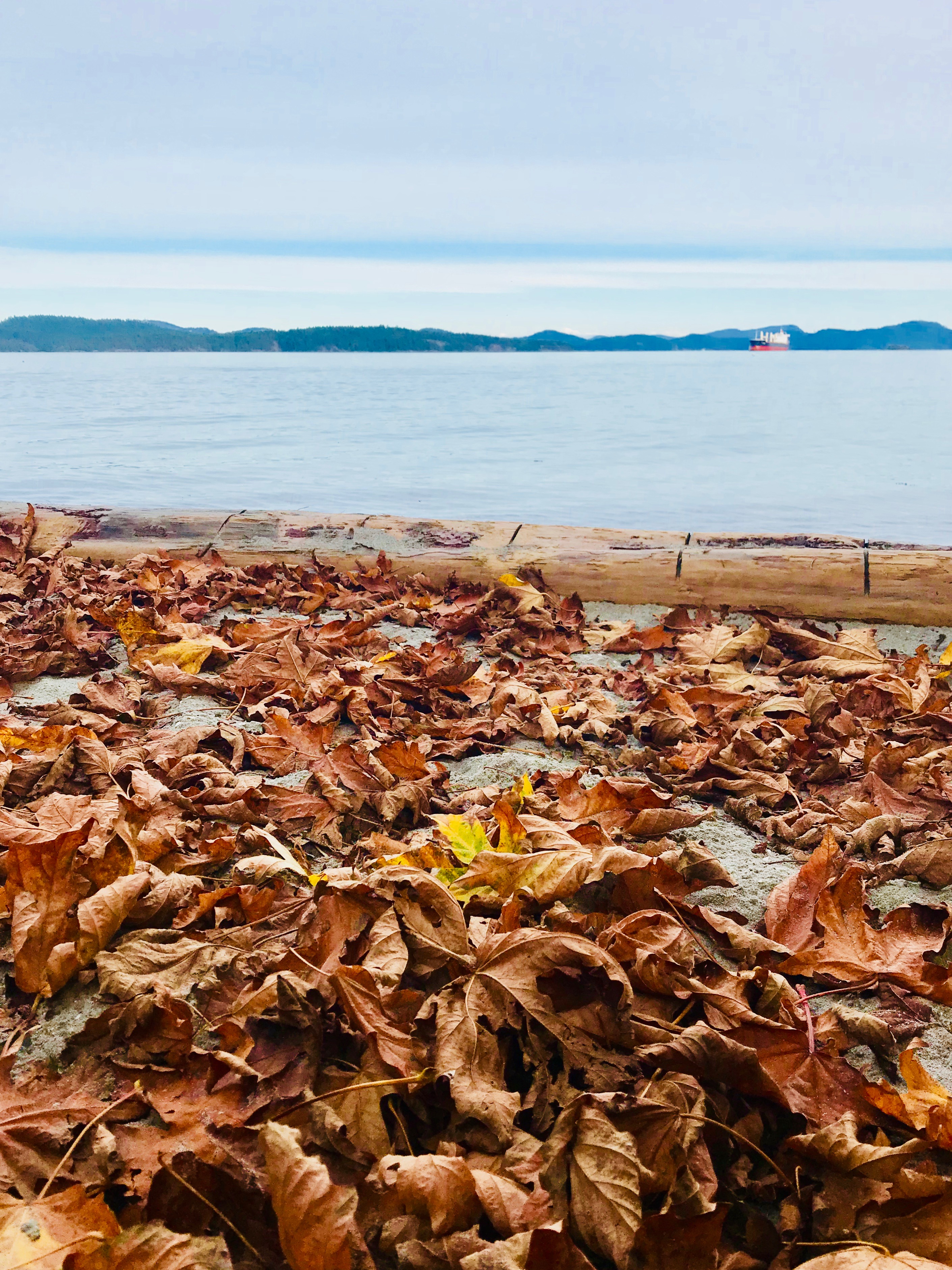 Вот интересное сочетание моря и сухих жёлтых листьев!