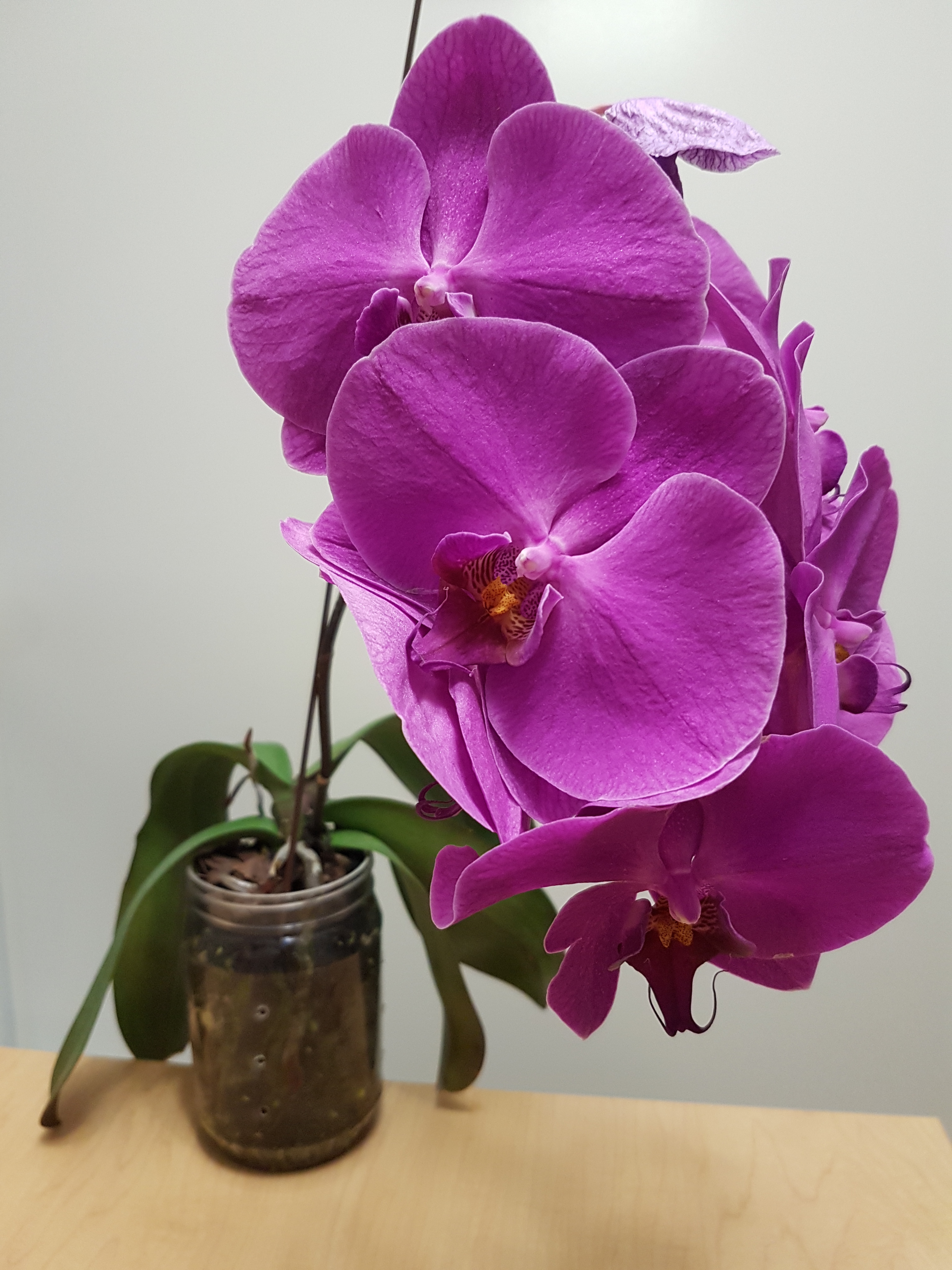 Fig. 3 My pride and joy, the Phalaenopsis. It has 9 flowers right now, with one of them wilted. Soon, all the other flowers will go as well. It's had them for a couple of months though, and I'll see them again next spring!