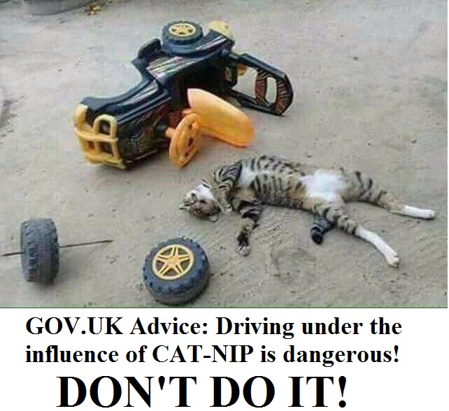 WARNING: Reckless, drunken cats have now been issued driving licenses by the powers that be. Apply extra vigilance & slow down. Angle your wing mirrors in a downward position for optimum visibility. Lol