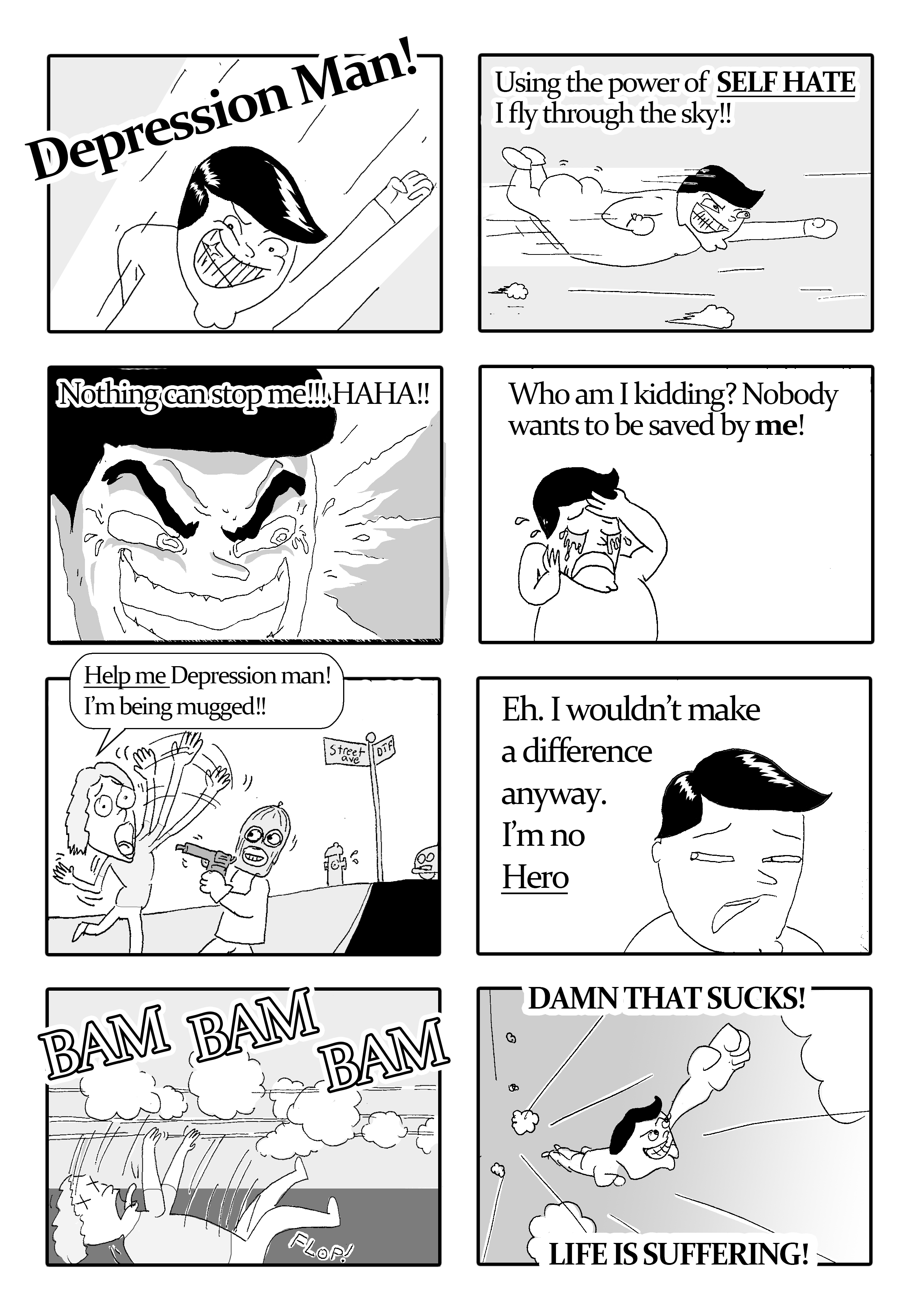 Depression Man! The Comicsethrogen (25)in #comic • 7 years ago (edited)I've been going through a bit of depression these days and I thought it might be interesting to find the positive in my "blues." Maybe my sadness is a super power?? Let me know what you think. I have more if people are interested... #cartoon #drawing #art #depression