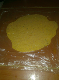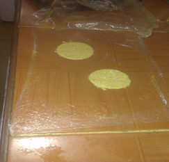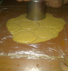 Extendemos la mitad de la bolsa le colocamos un poco de agua y sobre ella la masa en forma de bolita, tapamos con la otra mitad de la bolsa y aplastamos con una tabla u otra cosa que nos sirva, retiramos la tabla o aplastador y pasamos el rodillo teniendo así la masa un poco fina, con el vaso cortamos unos pequeños círculos.