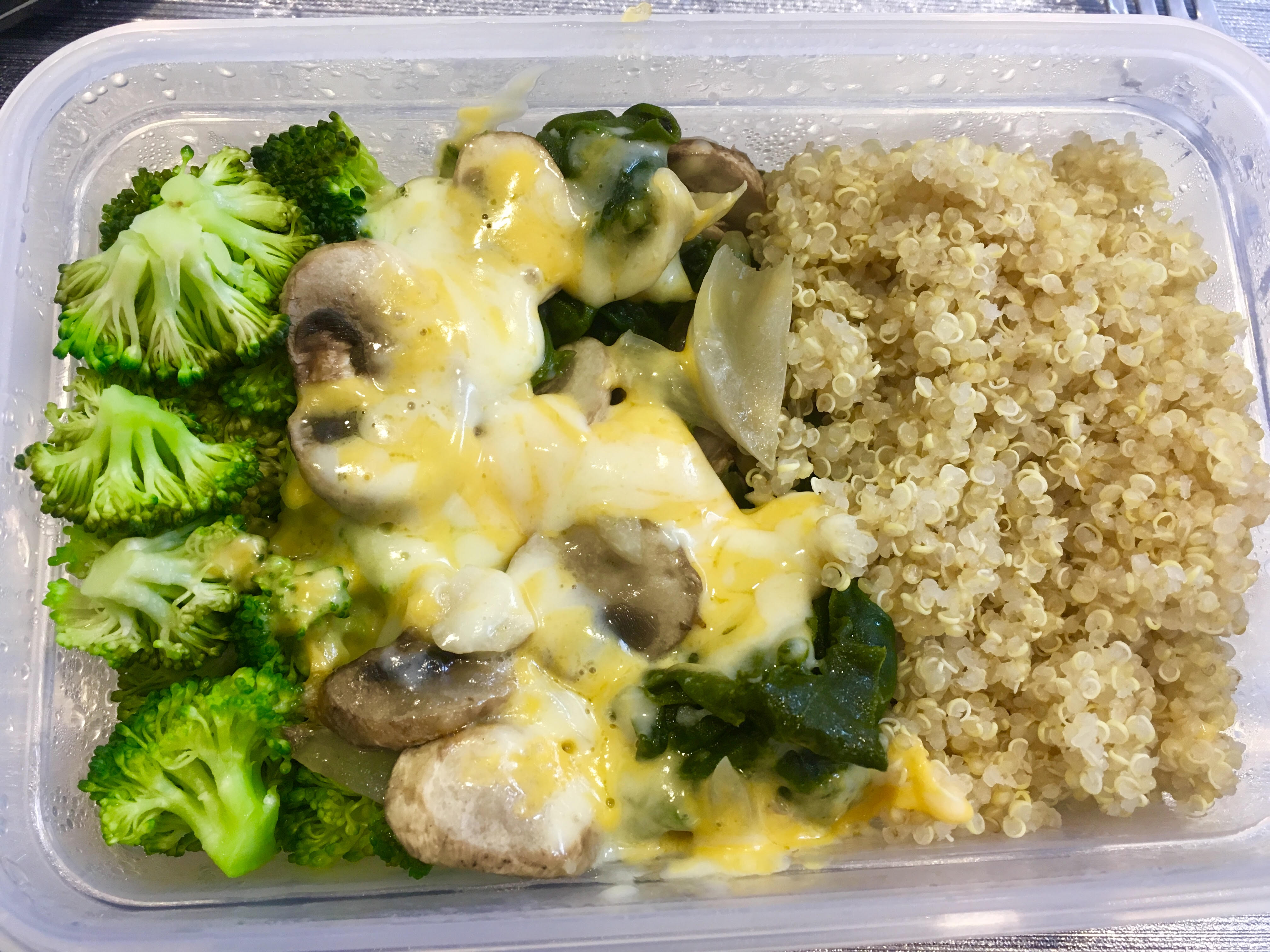 (Mi primer almuerzo vegetariano: quinoa, brócoli, espinacas salteadas con cebollas, champiñones y queso)