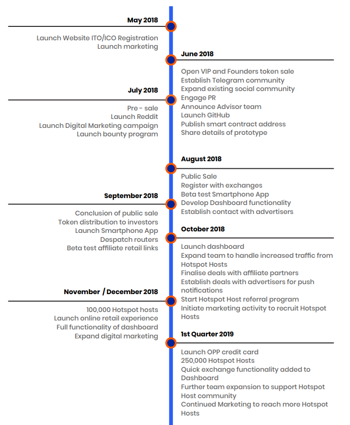 OPP tokens, which are an essential element of the platform, will be sold from a total ITO supply of 142 million tokens. The hard cap for the entire sale is set at £30.5 million. The standard sale price of one OPP token will be £0.30. During each round, unsold tokens will be added to Hotspot Host payment pool, which will reward hosts on the platform.