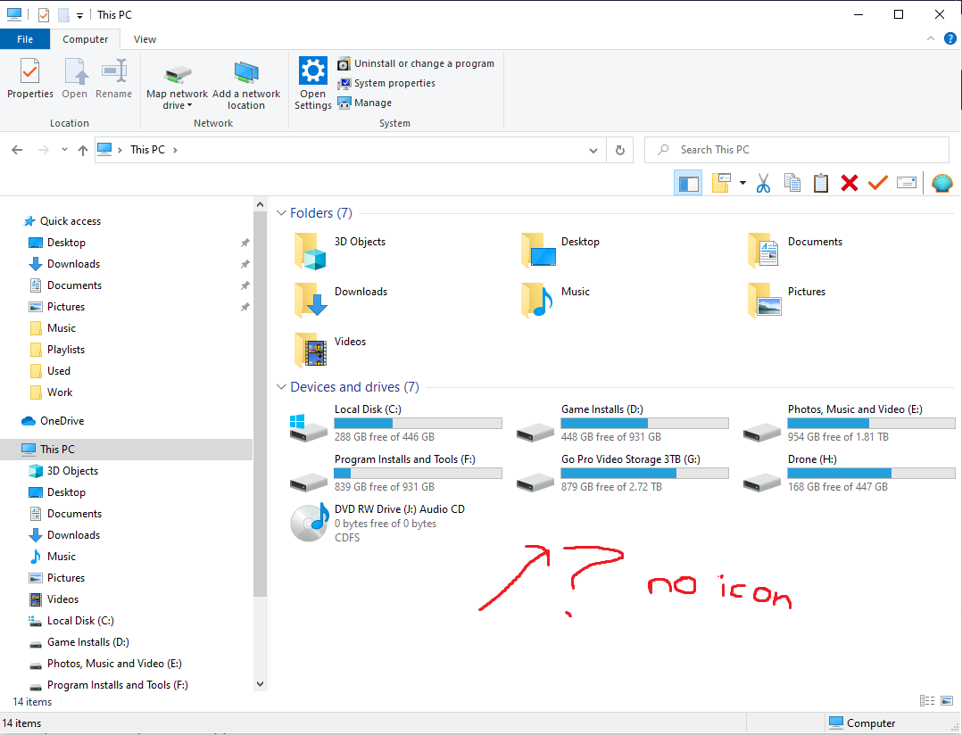 I MY COMPUTER (‘This PC’ it’s now called in Win 10) so I can see all my hard drives and devices, and I see no Apple iPhone icon.