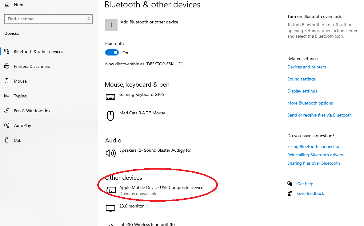 I then tried uninstalling all the drivers, and plugged the phone back in again and got the Windows notification that something has been plugged in so quickly double clicked it and got to the Bluetooth & Other Devices menu in Windows and saw that the driver was unavailable for my iPhone, even though Windows knew it was an iPhone I plugged in.