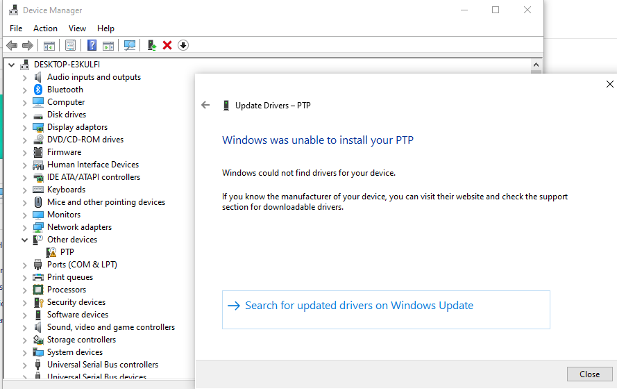 I tried updating the PTP driver and Apple drivers by pointing to the usbaap164.inf drivers on my hard drive, which I had downloaded separately and this still didn’t work.