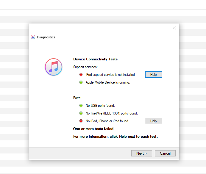 I ran a diagnostics test within itunes and the results said it the ‘iPod support service was not installed’.