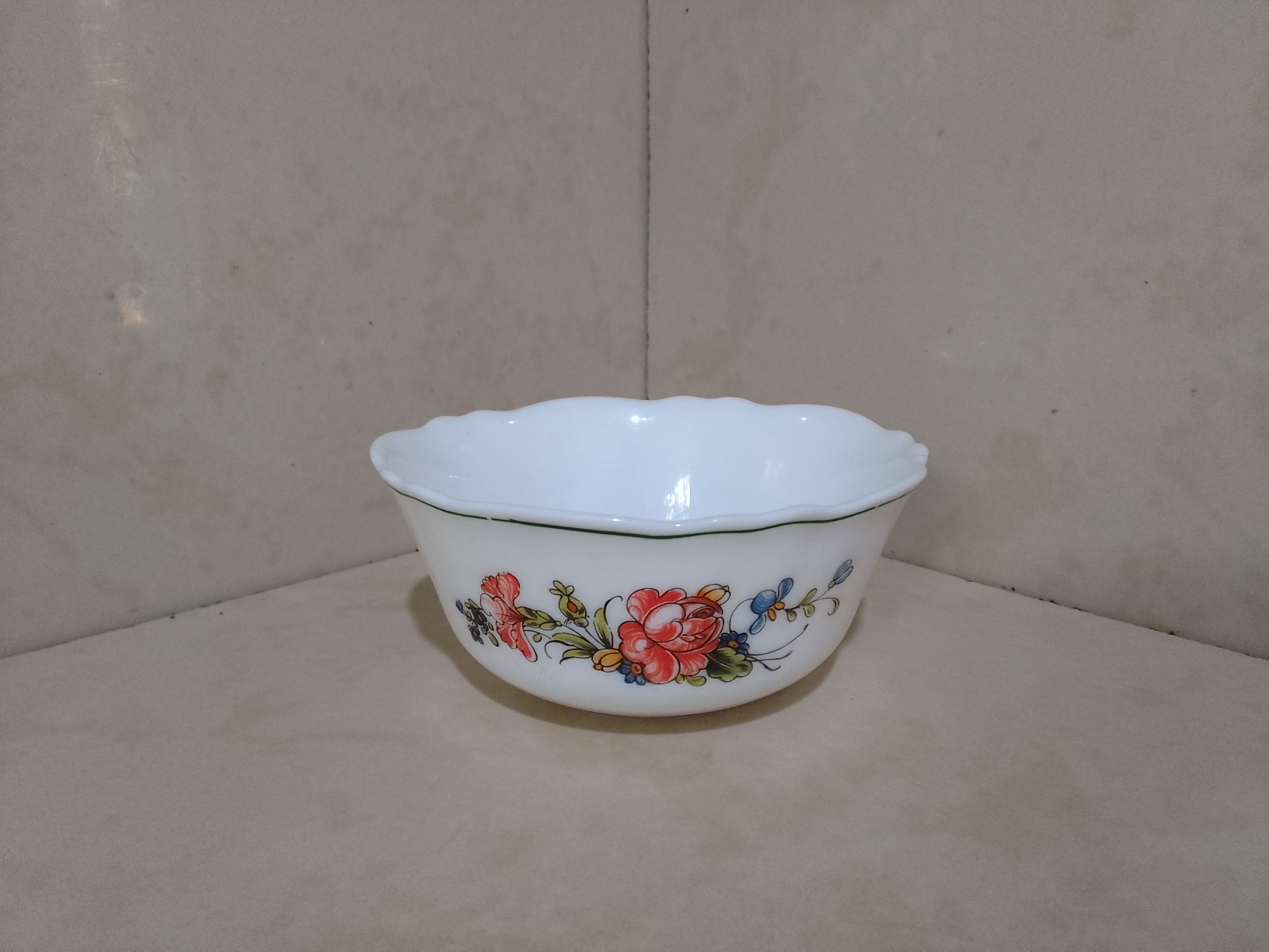 Esa es la única dulcerita que queda de un juego que compro mi mamá yo las use cuando era niña y ella me la regaló para que le diera comiditas cuando nació mi hijo. La cuido mucho para que no se vaya a partir ya que es de vidrio. Así que por lo bajito debe tener unos 40años entre la familia.