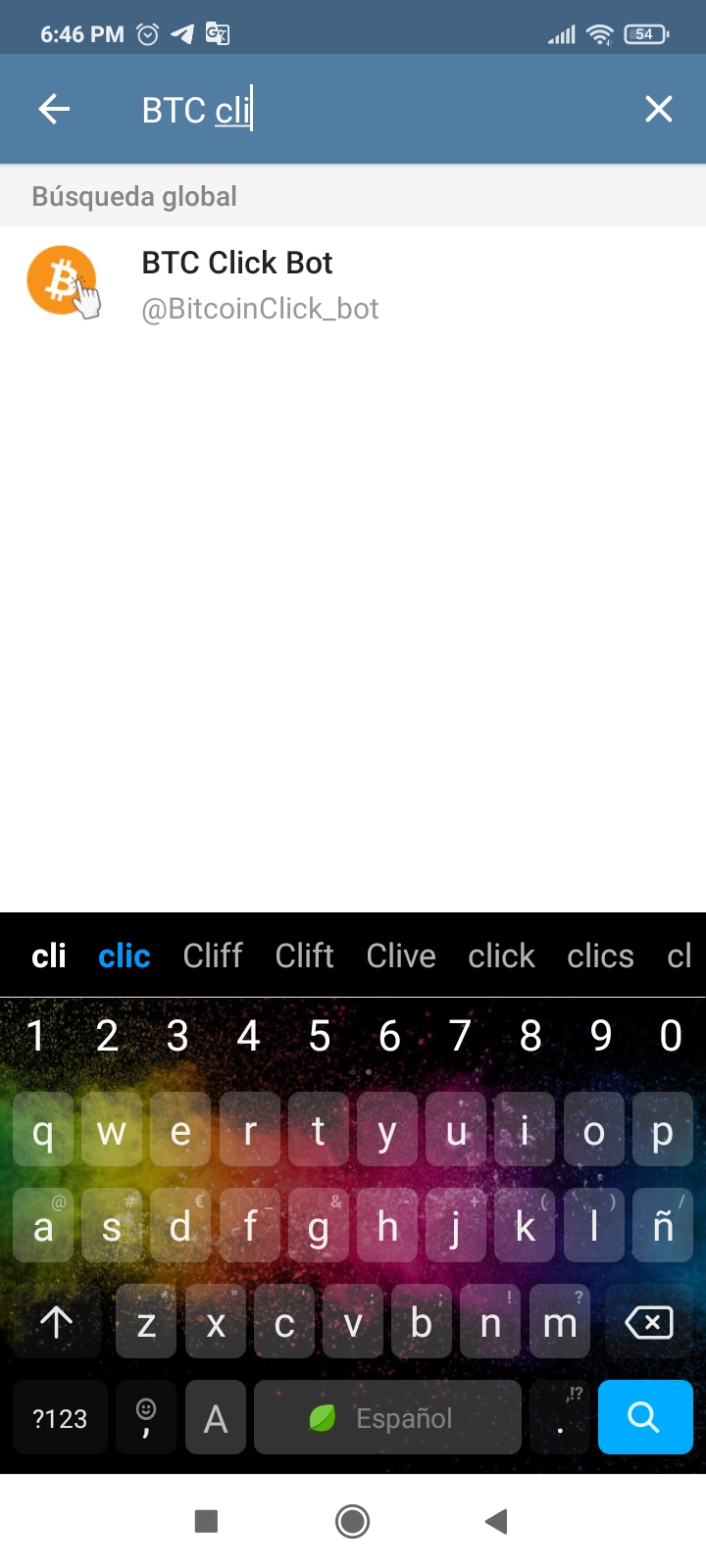 II Paso siguiente: vamos a dirigirnos a nuestro telegram y vamos a darle a el buscador (la lupita), seguidamente escribimos este comando "BTC Click bot".