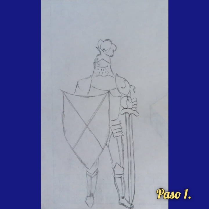 Bien, al momento de realizar este dibujo lo primero que hice fueron las líneas principales del mismo (la silueta y líneas más importantes de la armadura, el escudo y la espada), como se observa en la fotografía: