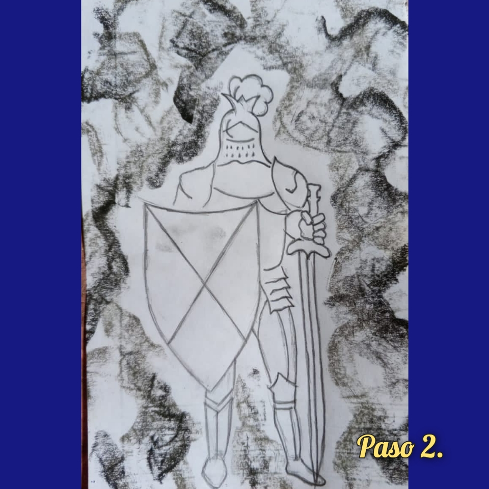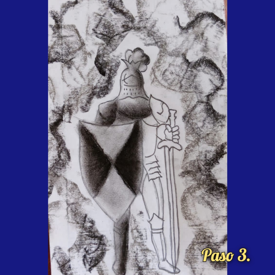 Luego, inicio la confección de la armadura, igualmente ayudándome con la tiza, dibujo los detalles de la misma, dándole forma. Hago lo mismo con el escudo; el resultado de este paso lo vemos a continuación: