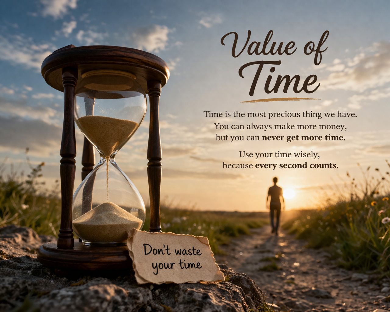 Time is the most precious thing in the world. We can earn money again if we lose it but we can never get back the time that is gone. Every second every minute and every hour is important. Life is made of time so if we waste time we are actually wasting our life.That is why wise people always use their time carefully. In our daily routine many of us waste time without thinking.We spend long hours on mobile phones watching unnecessary videos or doing useless activities. At that moment it feels normal but later we realize that we have lost something very important. If we use that same time for study learning new skills or helping our family it can make our future better.
