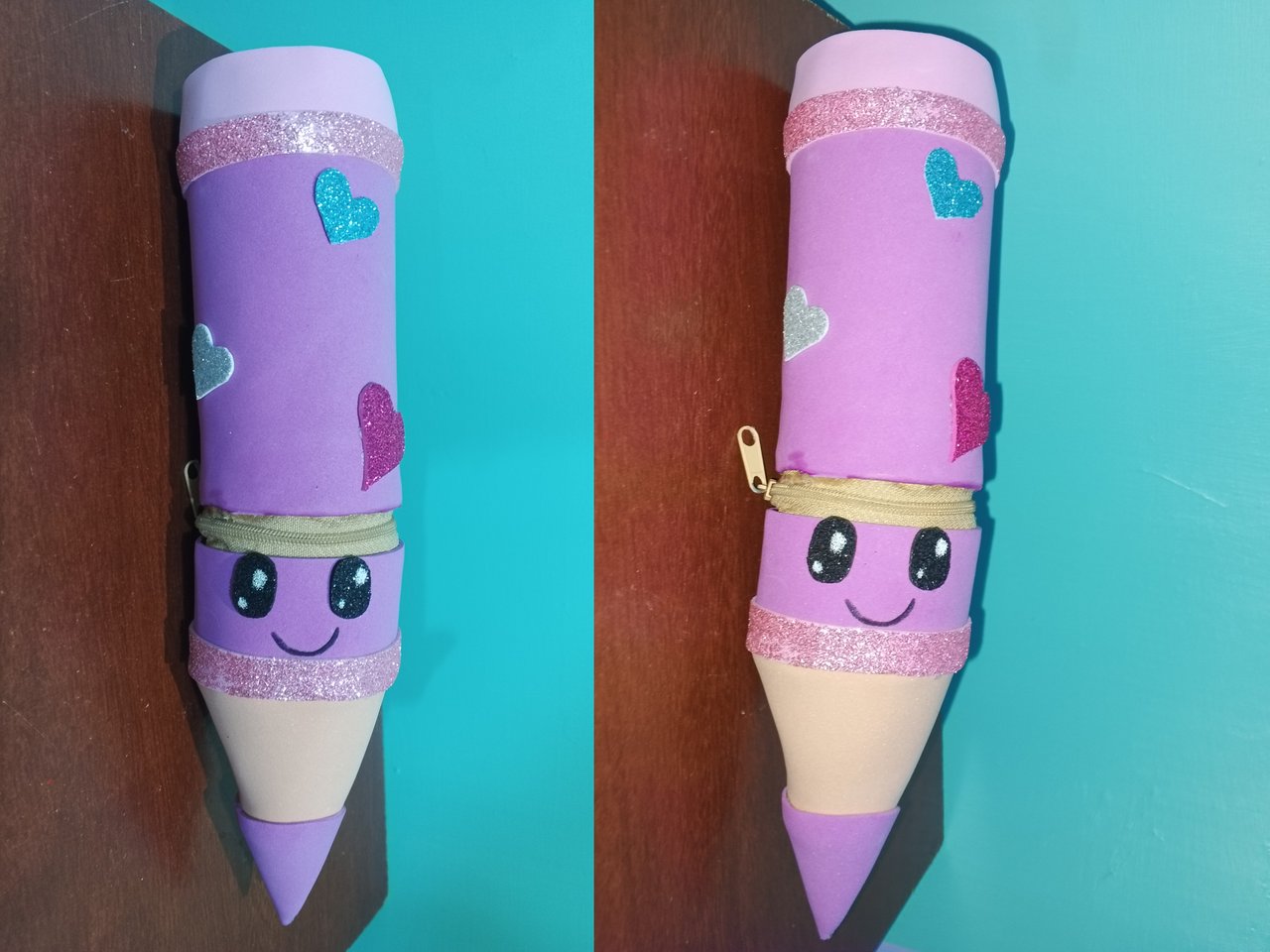 Cartuchera en forma de lápiz con materiales reciclados y foami