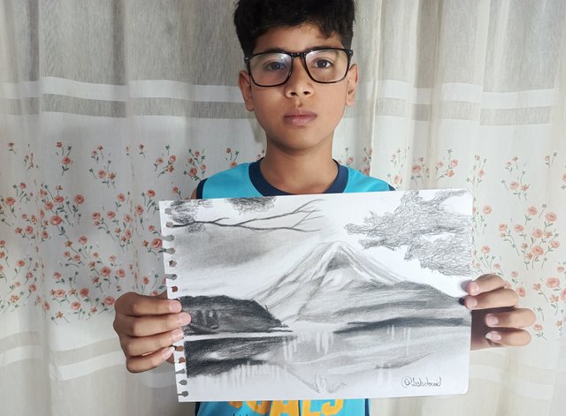 Este dibujo representa un paisaje natural que consta de una montaña de clima frío , con algunos arboles y nubes, además de un río que pasa por el frente y reflejando la belleza natural de la montaña y sus alrededores.