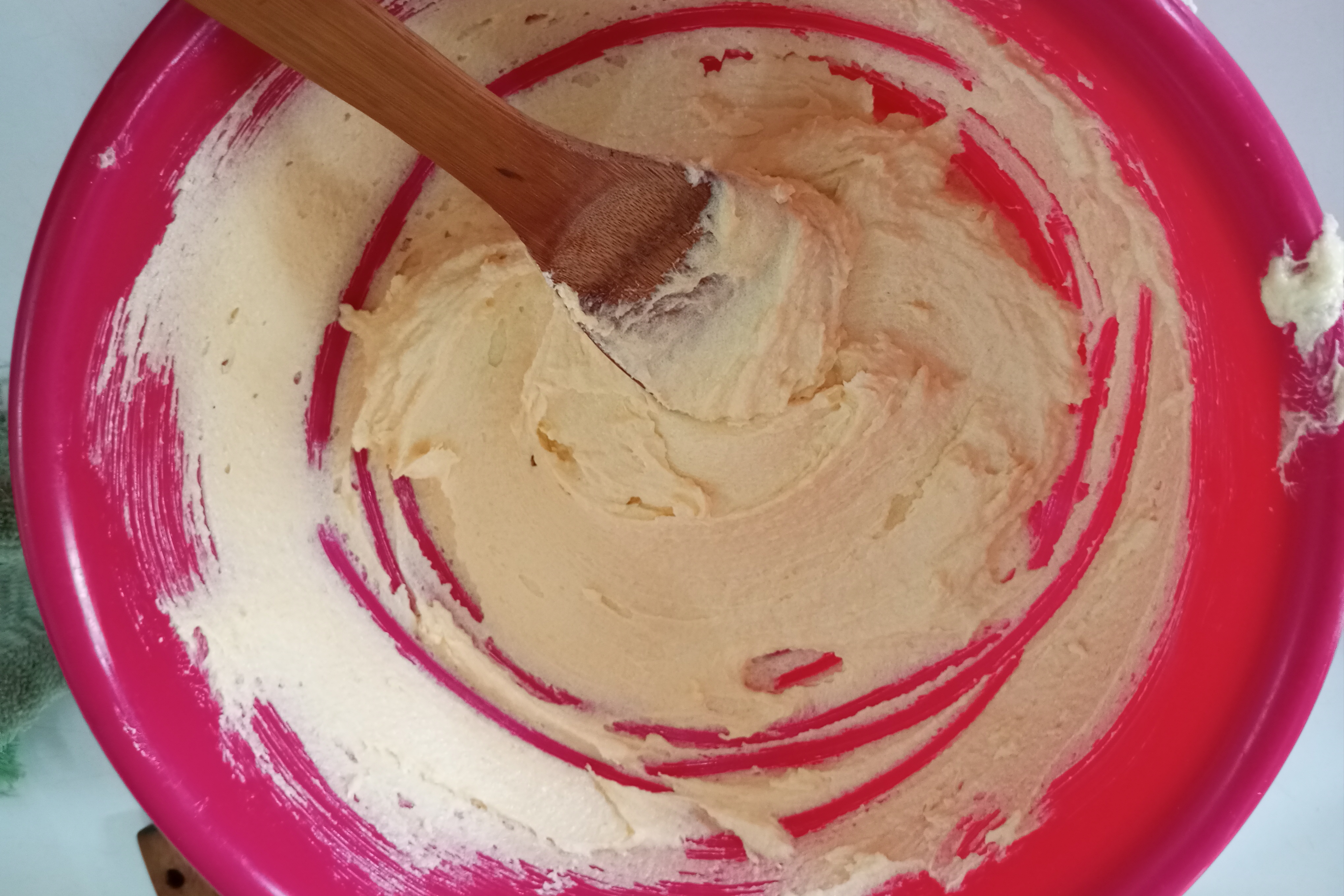 Seguidamente agregamos el huevo , y si deseas agregar Rayadura de limón este es el momento, batimos bien hasta integrar bien los ingredientes