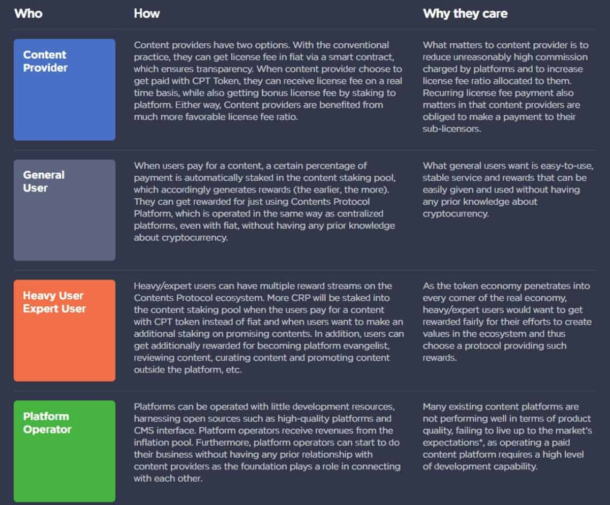 CPT is a token available for exchange, it will be used to purchase content on the platform, as well as to pay for the work of project participants.