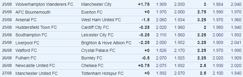 England Premier League Week 01 Asian Betting Lines