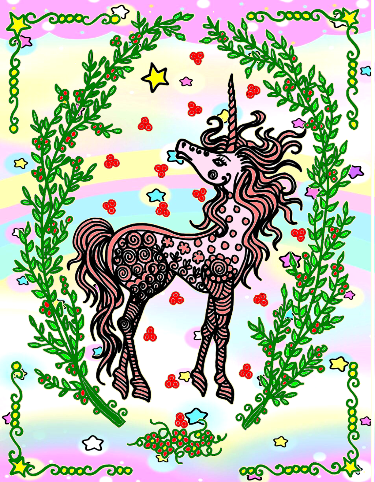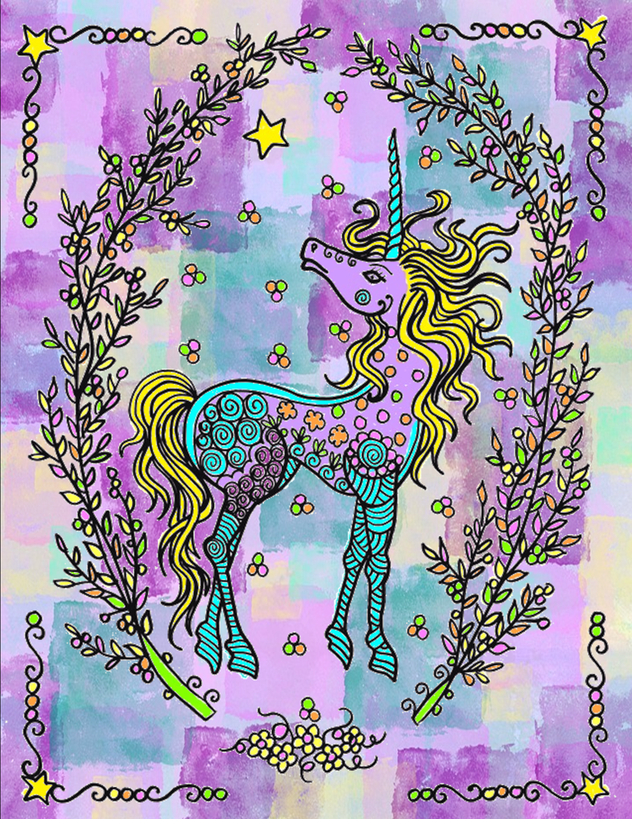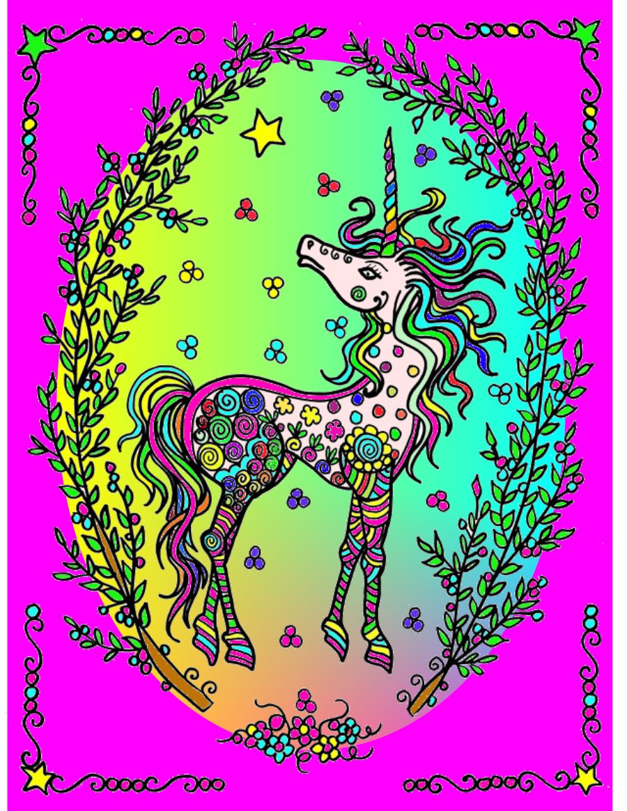 Usually, when speaking of unicorns, we tend to see candyfloss colours - so your darker and almost 3d version stands out for me. What I like is that the darkness does not give a feeling of goth, it mostly highlights the other colours.
