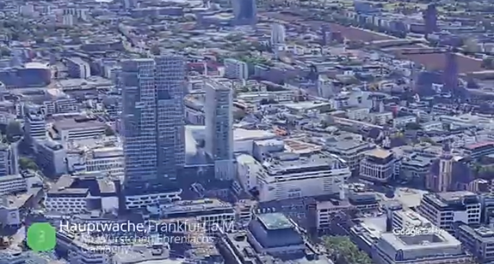 Still on the same scene; from an incredible aerial projection, you can see the hole right there in the Hauptwache plaza surrounding. The depressed tunnel actually leads to an underground pedestrian area, with several shops and the public transportation station. The locals call it "das loch" which means the hole in English.