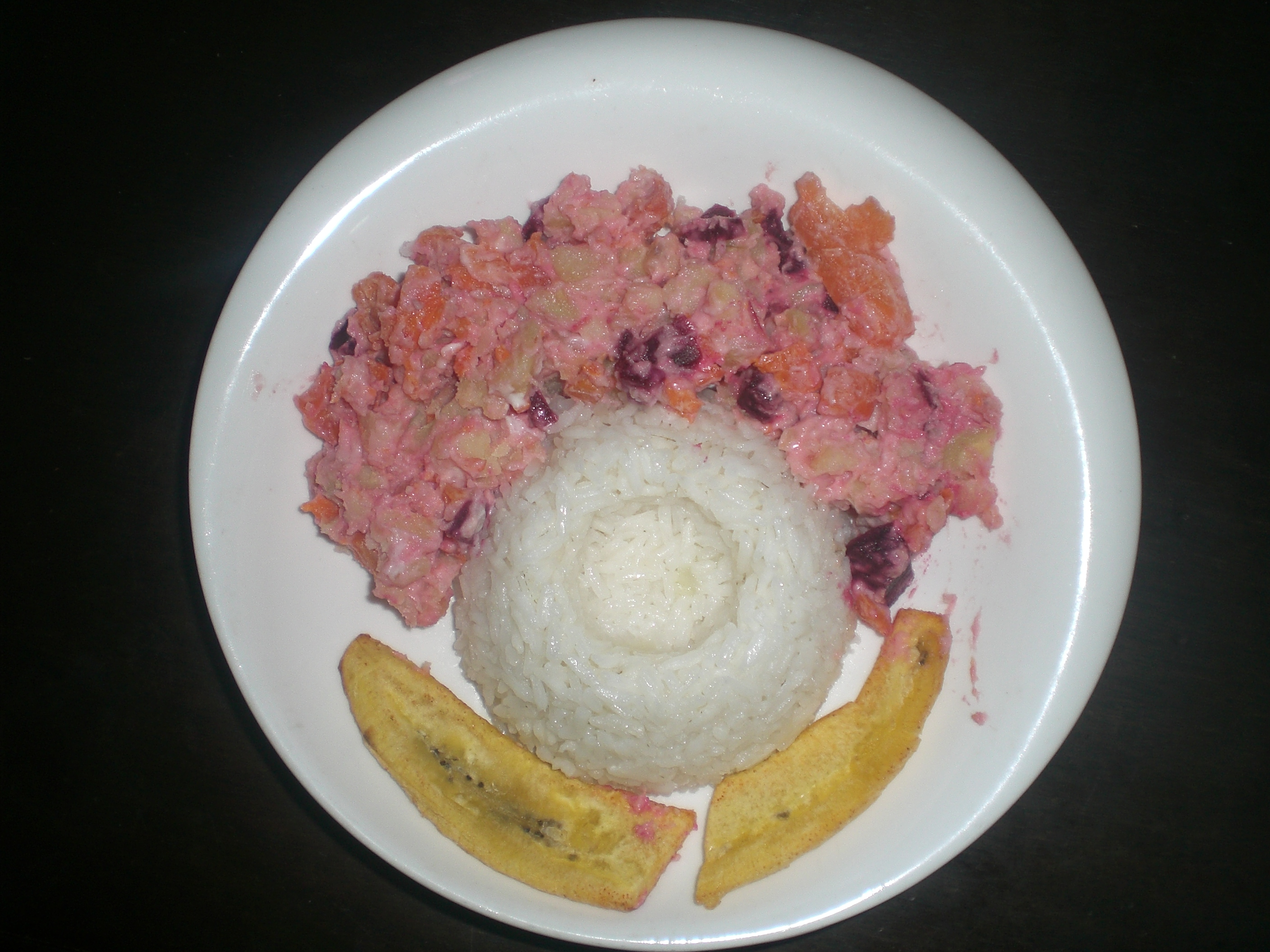 Salad of potatoes, carrots and beetroot, with rice and banana.