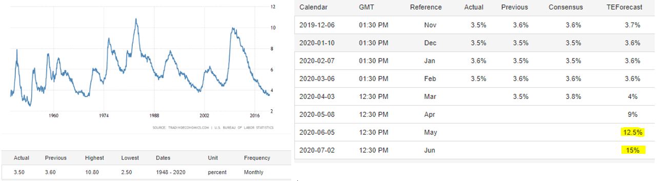 The US expecting record high unemployment rates in May/June. The graph is from 1948-2020.