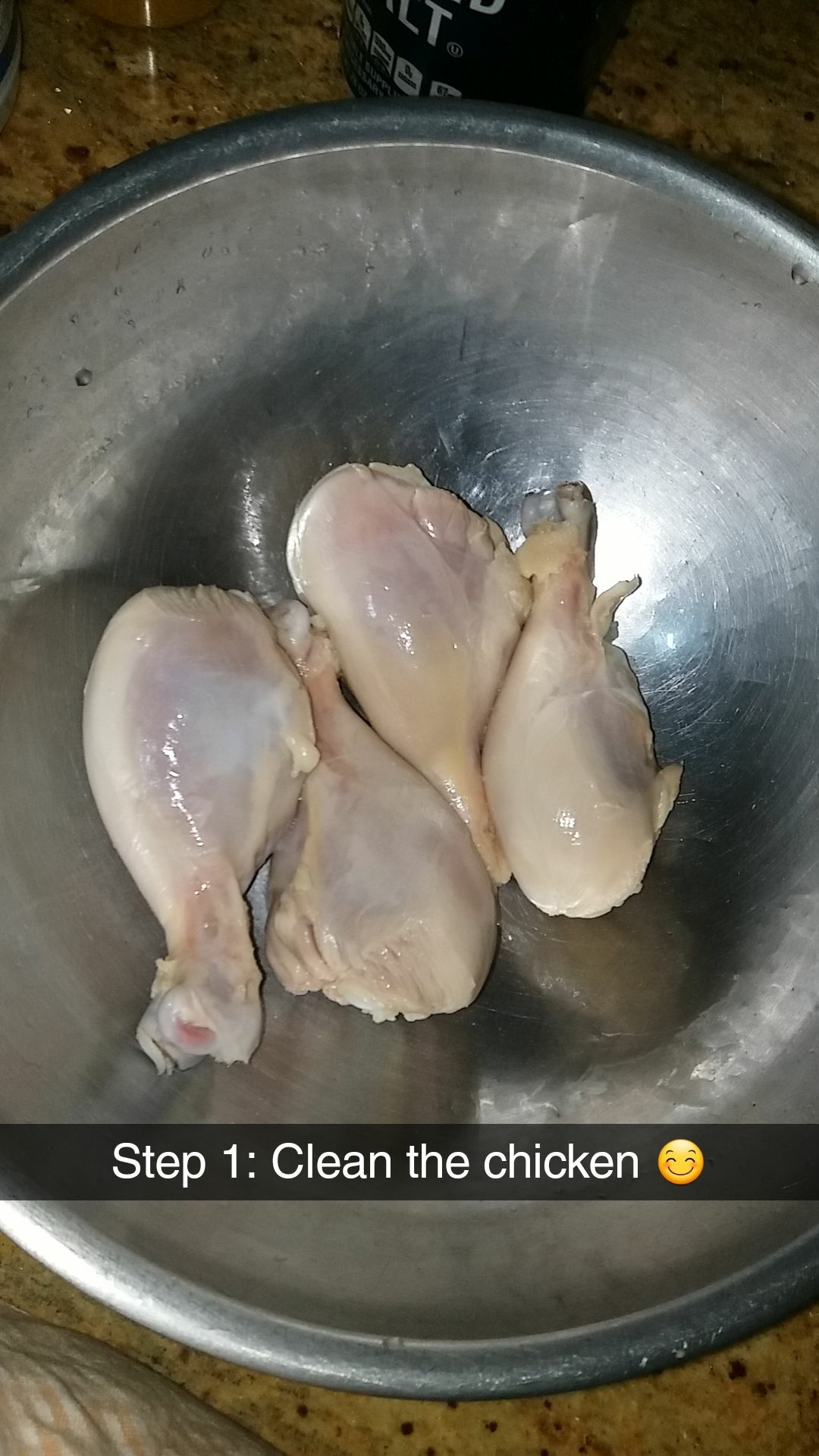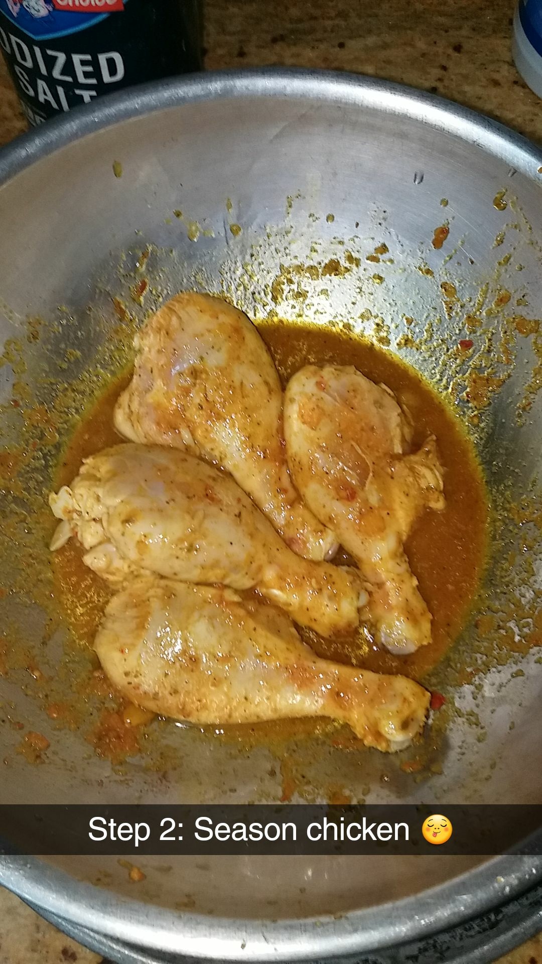 2 . Season the chicken using minced onions, garlic, tomatoes and peppers with a sprinkle of salt, oregano, curry and black pepper.