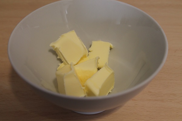 Lo primero que debemos hacer es cortar la mantequilla en trozos. Luego echamos en un recipiente la leche y los trozos de mantequilla.
