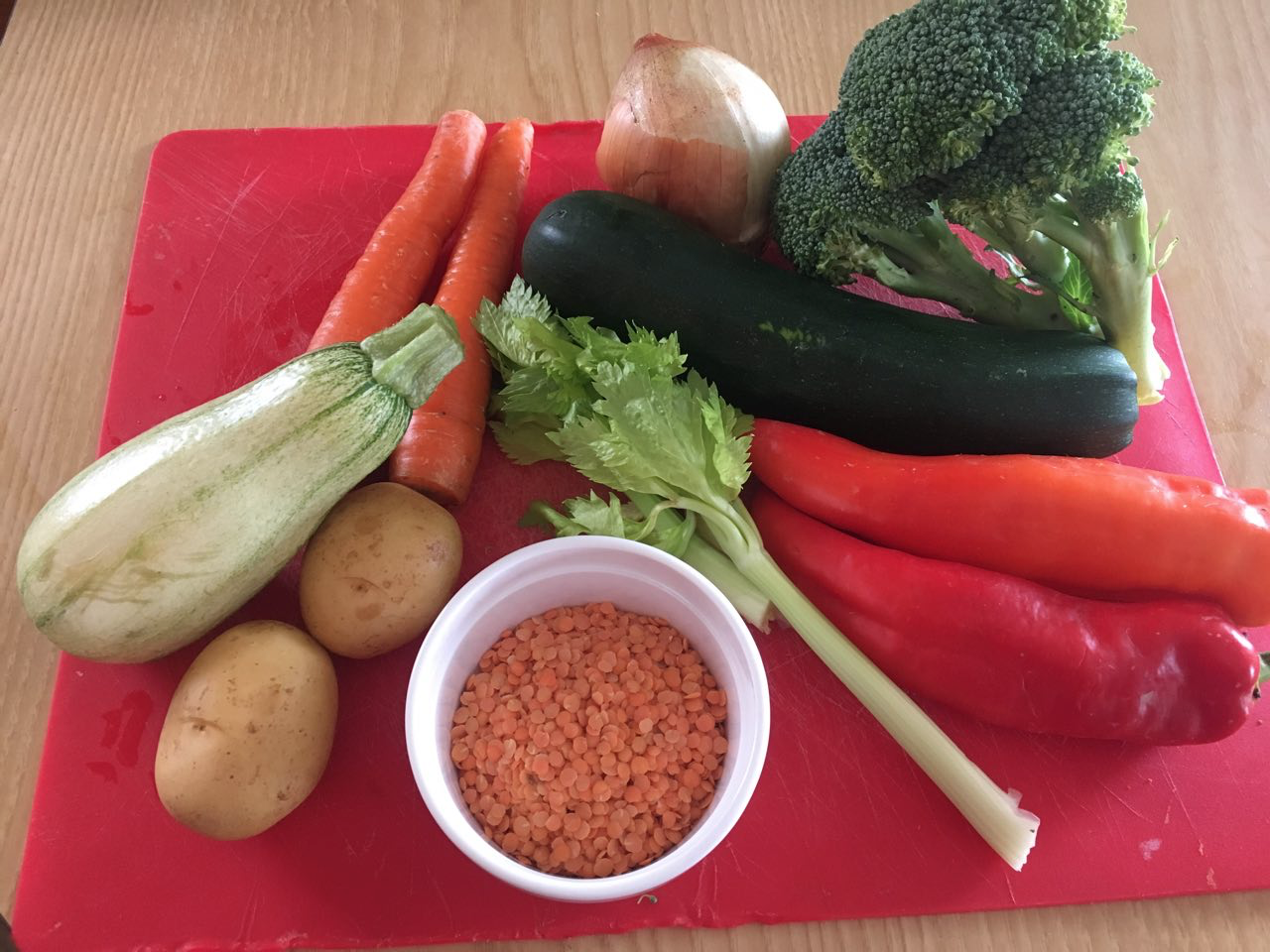 Potato, carrot, baby marrow, squash, red and yellow peppers, some celery and onion