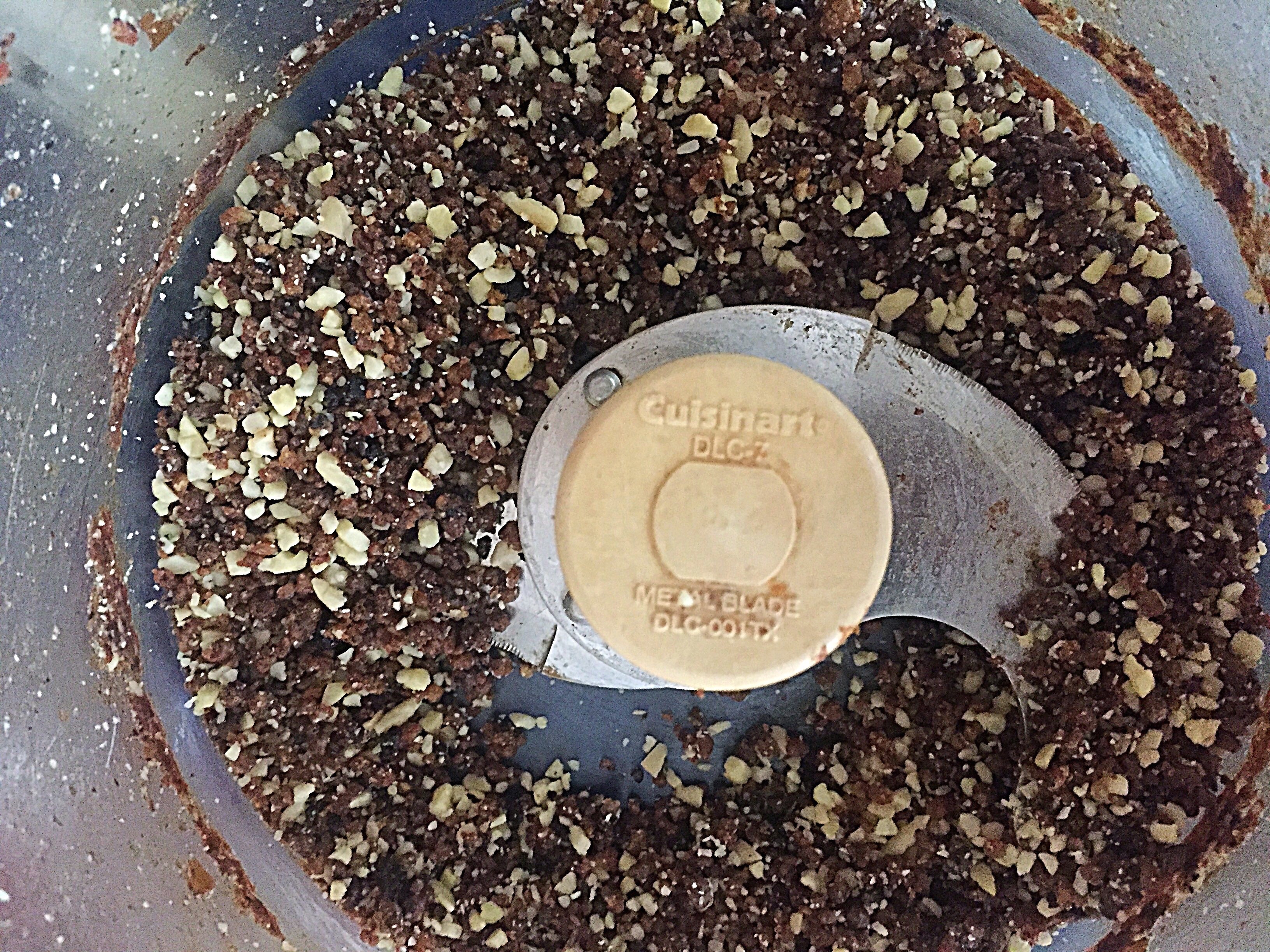 Pulse until the nuts are finely chopped but not pulverized because you want to leave some texture in the brownies. Transfer the mixture into a bowl and gently press the date crumbs together to form a ball.