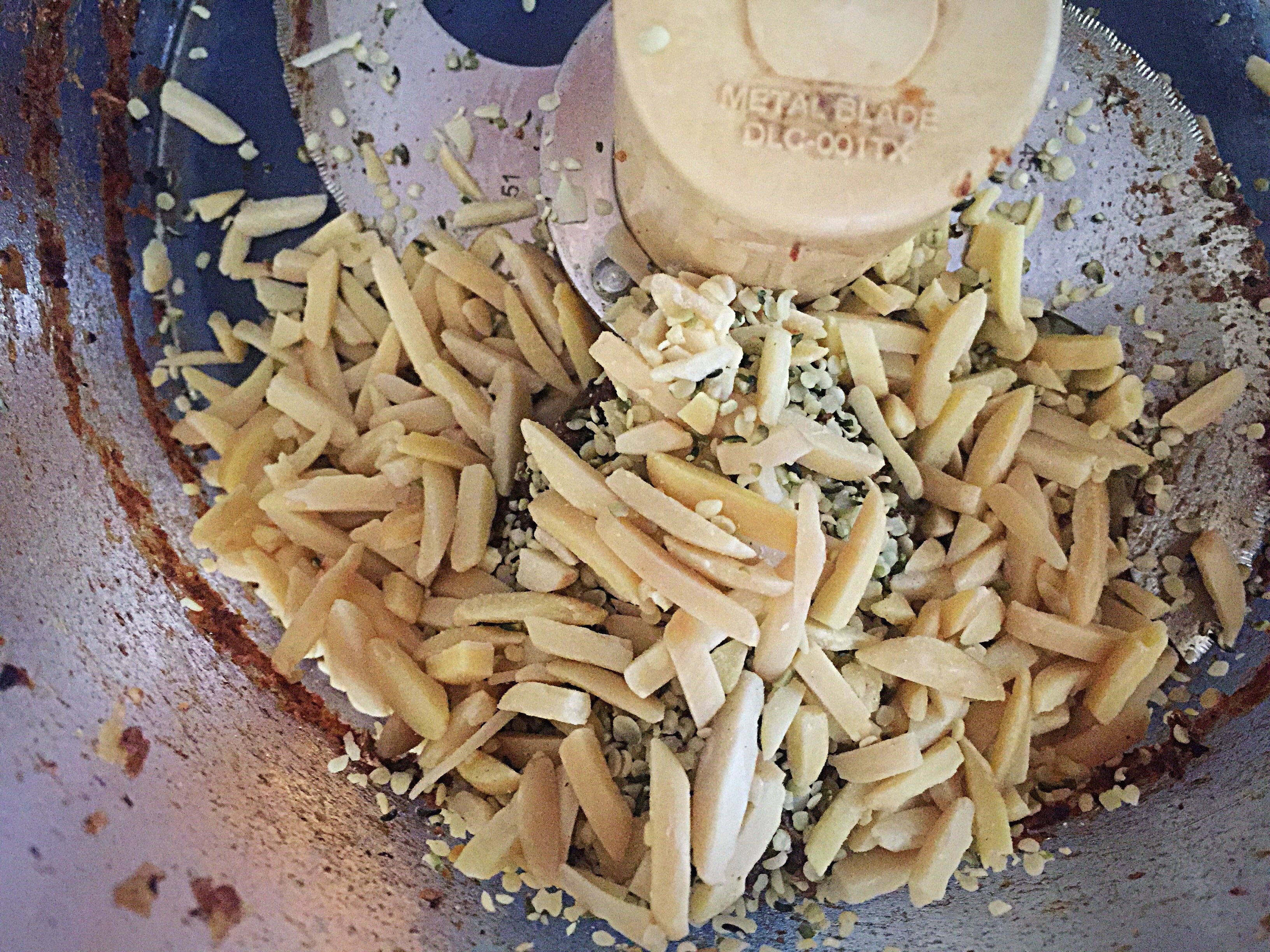 Add in the nuts, hemp seeds and coconut oil. If you are using spices, you want to add them along with the nuts.