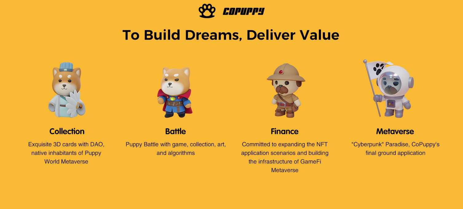 CoPuppy is an exciting NFT platform that offers a variety of NFTs, battle, lending, rating, gamefi, and metaverse.