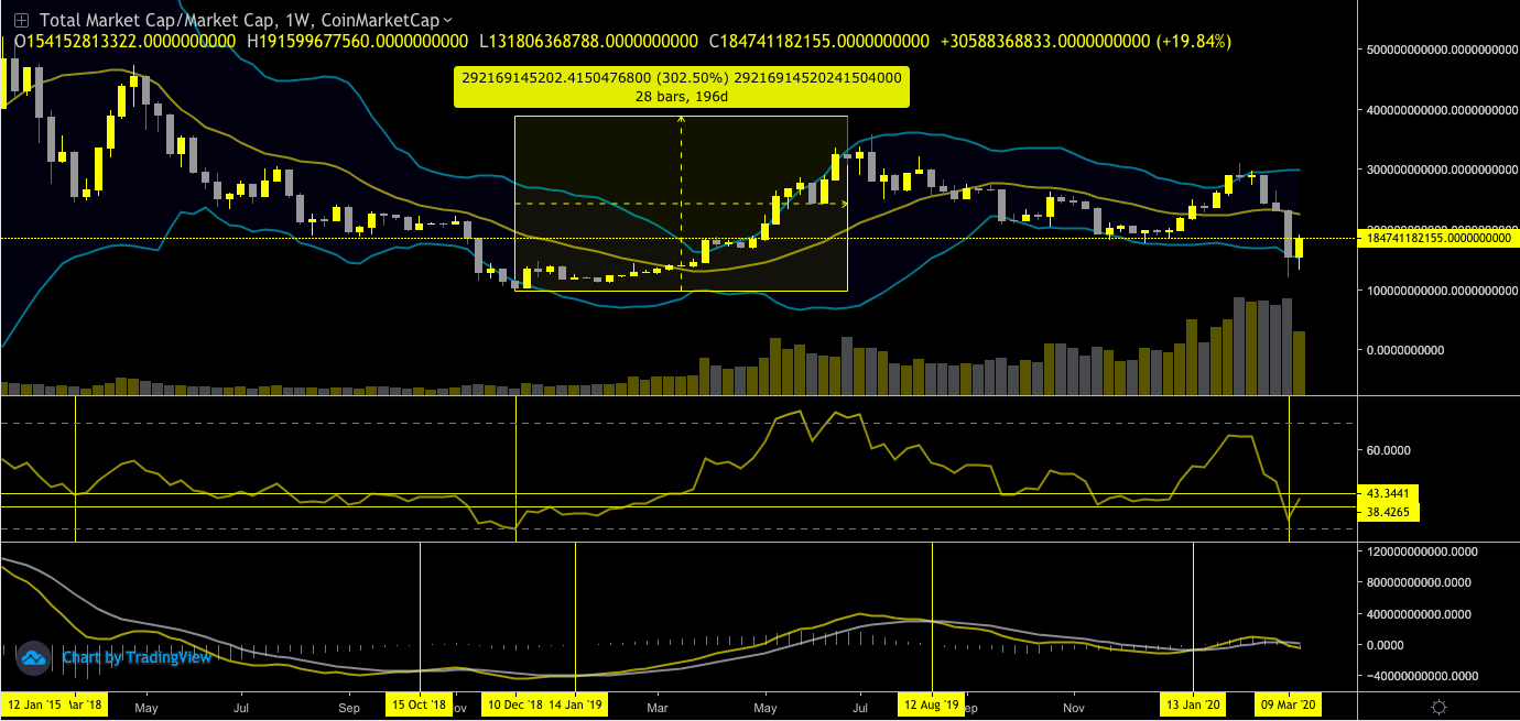 Market has been seeing some growth over the past two weeks, following the hard drop end of February. Supply levels were hit, which resulted in volatile reactions in the market. Market found support in the $120B area, with the RSI touching 30.