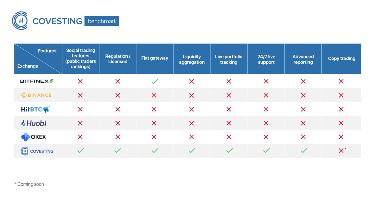 Over the last few months, Covesting has made significant progress towards achieving our ultimate goal. Our teams are working around the clock in order to deliver the polished, unique product we set out to create. We have grown from a small team of just two to nearly 40 global employees across two offices. We have assembled an executive team with 100 years of combined expertise in the investment industry. We offer enterprise level infrastructure and 24/7 support for all our customers. Already now, everyone can witness that Covesting is about to offer the most features compared to other exchanges, such as our Social trading features, a fiat gateway with proper banking solutions, live portfolio monitoring tools, advanced reporting, and much more. Check out the comparison table below.