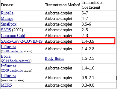 The speed of transmission is measured through “Transmission Coefficient” which is the rate that disease moves from infected individuals to susceptible individuals in the population. It must be between 0 and 1 for the disease to be self-contained or contained locally. Given below are the transmission coefficient of some common airborne diseases (source: https://en.wikipedia.org/wiki/Basic_reproduction_number). I have also included Ebola since many people are quoting this in mainstream media not realizing that Ebola is not an airborne disease.