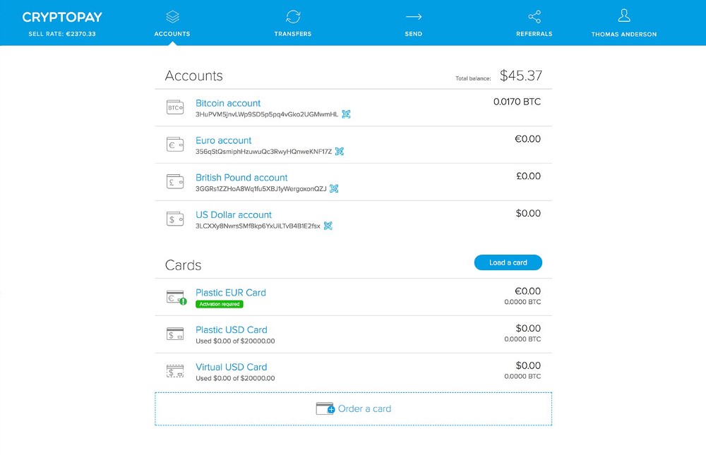Flex Accounts — Cryptopay’s system makes it easy to convert your bitcoins into the fiat currencies supported by their platform. You can use Flex Account to secure your money against bitcoin price fluctuations. Send your bitcoins to anyone, anywhere! Convert them into GBP, USD or EUR and you can pay with their card at businesses around the world.