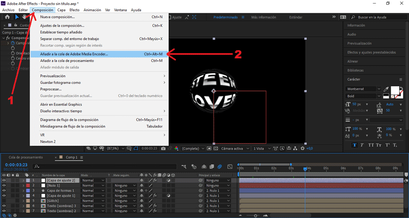 Presionamos Composición/Añadir a cola de Adobe Media Encoder...