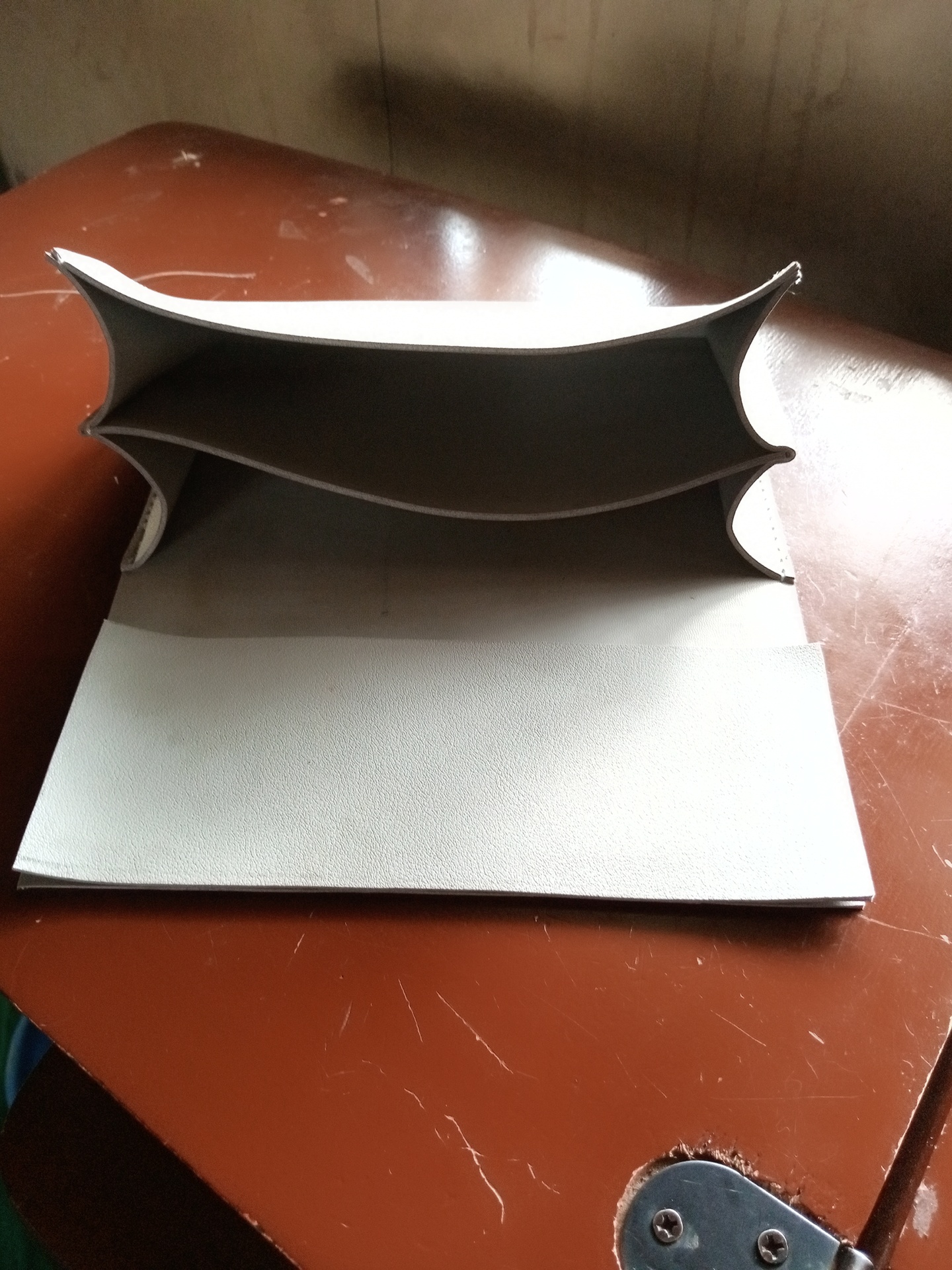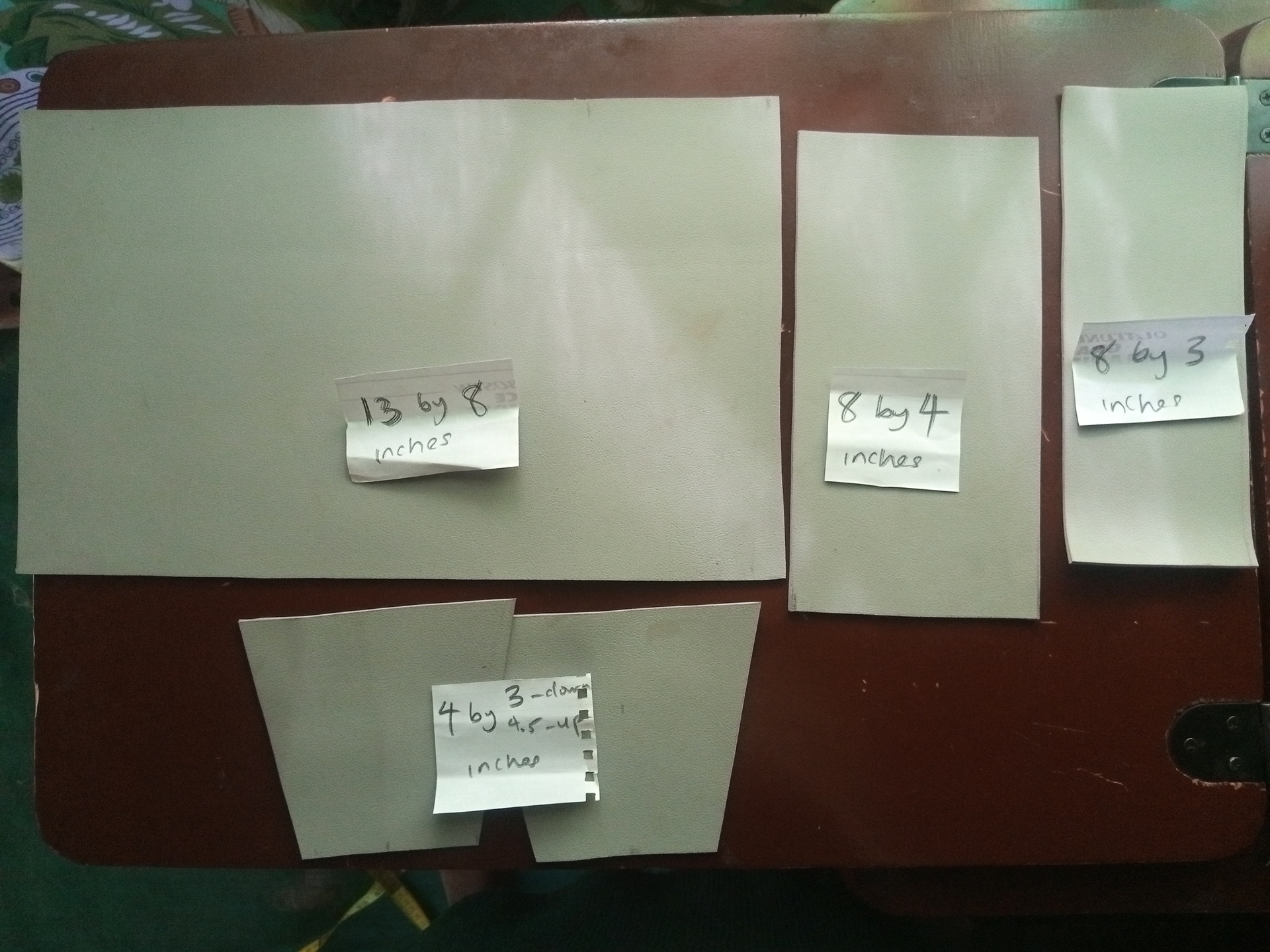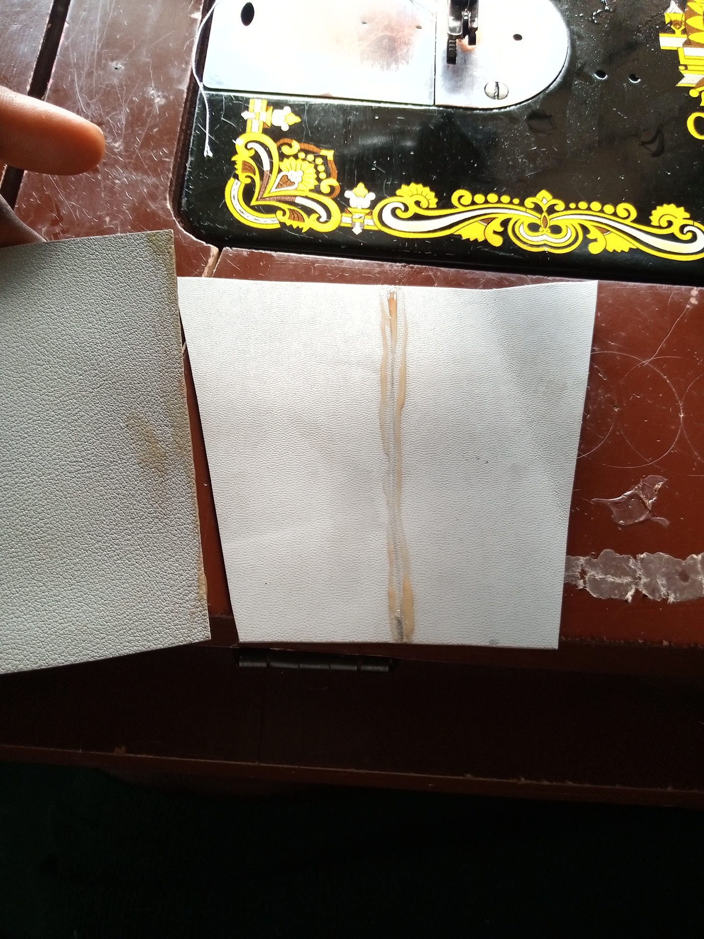 - I located the middle of the small piece of the side, drew a straight line and applied gum and also to the tip on the middle leather (the 8 by 4 inches leather)
