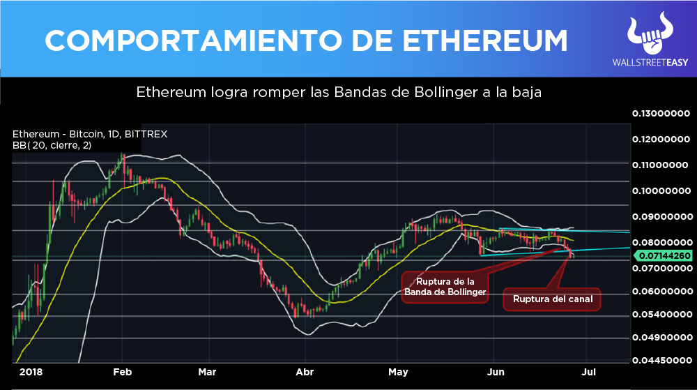 Al analizar otras criptodivisas como Ethereum, se observa que esta sí rompe las bandas de Bollinger a la baja, así como los niveles que registró en el mes de mayo, señales bastante negativas para el mercado. Al día de ayer, se negociaba por debajo de $426.