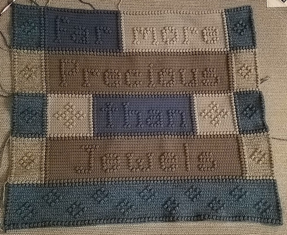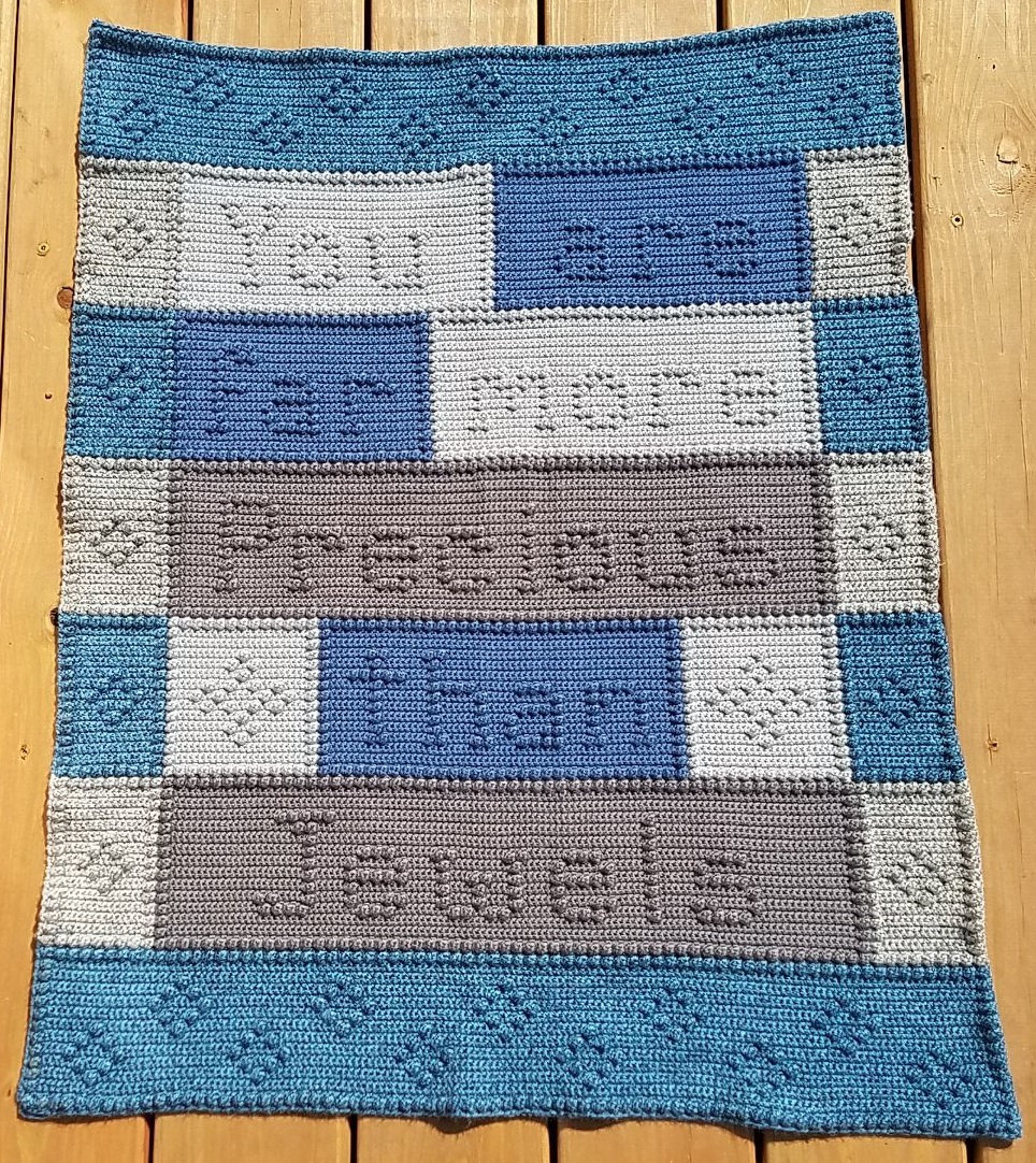 The Blanket itself spells out the worlds 'You Are More Precious Than Jewels'. I worked it with Premier Everyday yarn skeins, though I don't have them on hand to be able to note what the colors were. It took me about two months to do due to the complexity and all the counting of the stitches, and I still messed up in a few places shhhh, but I had it done and to my sister in time for her baby shower! Yay! The only part I didn't get was the last picture of 'you are' before it was finally done and I could get a good picture of it in the sunlight, which is alright as I was starting to run short on time before the deadline.