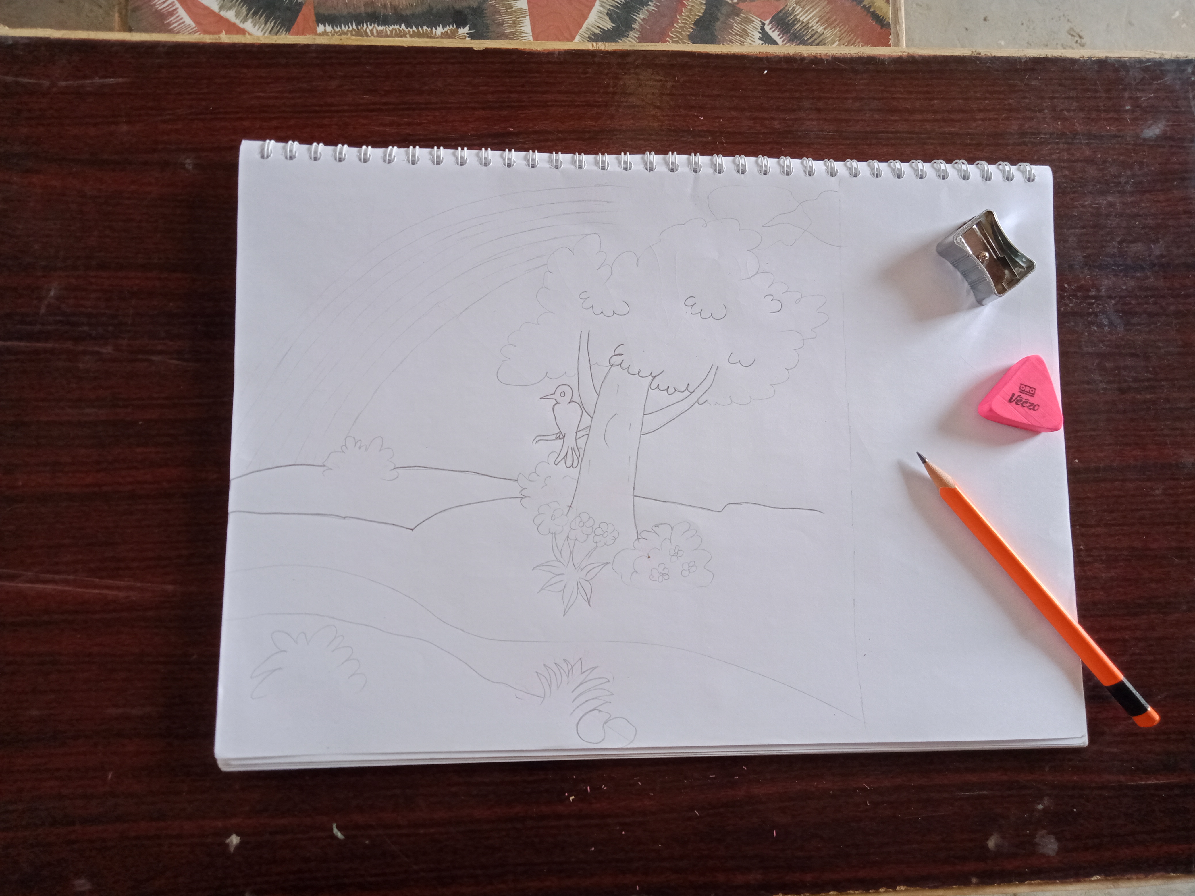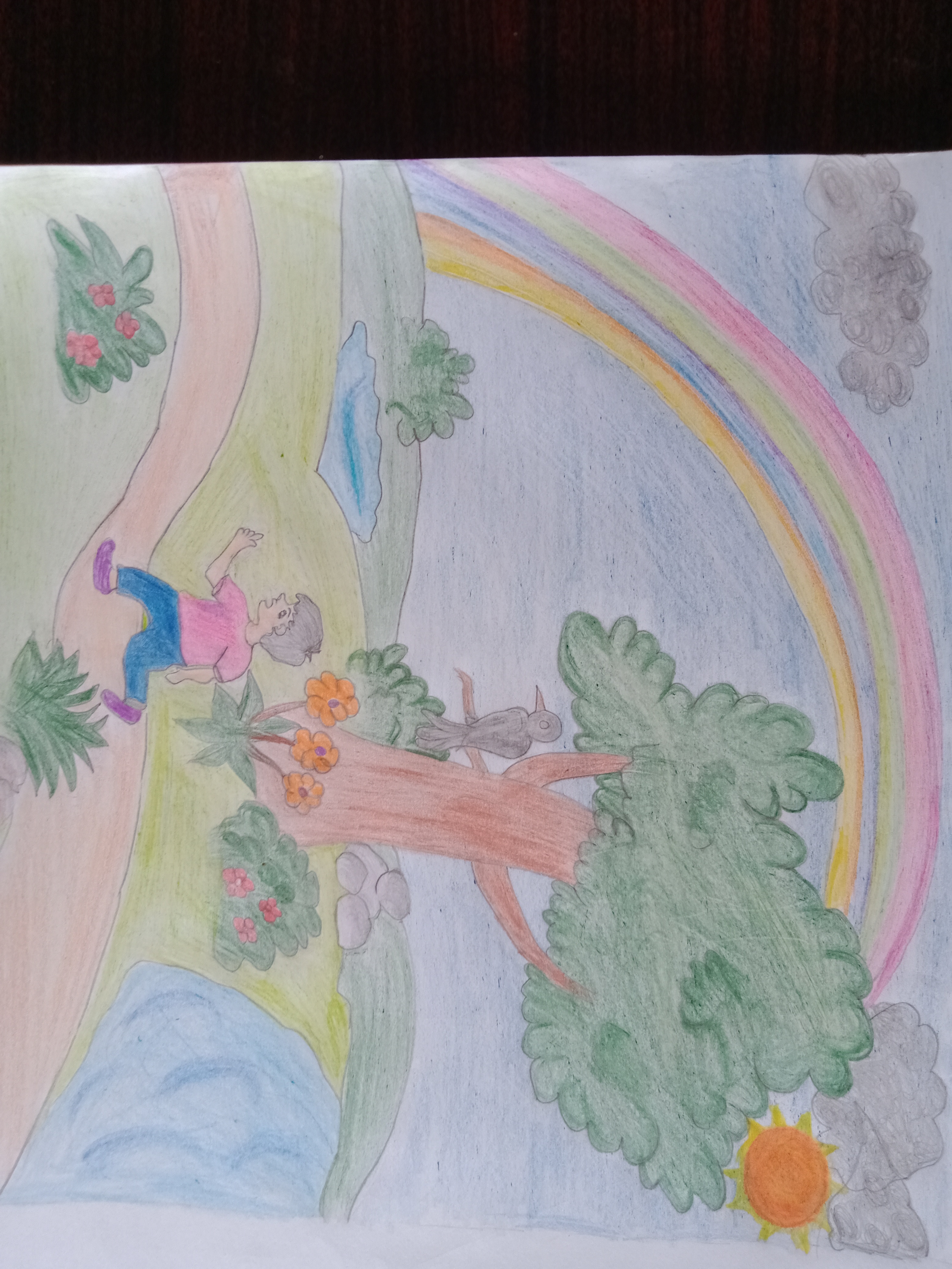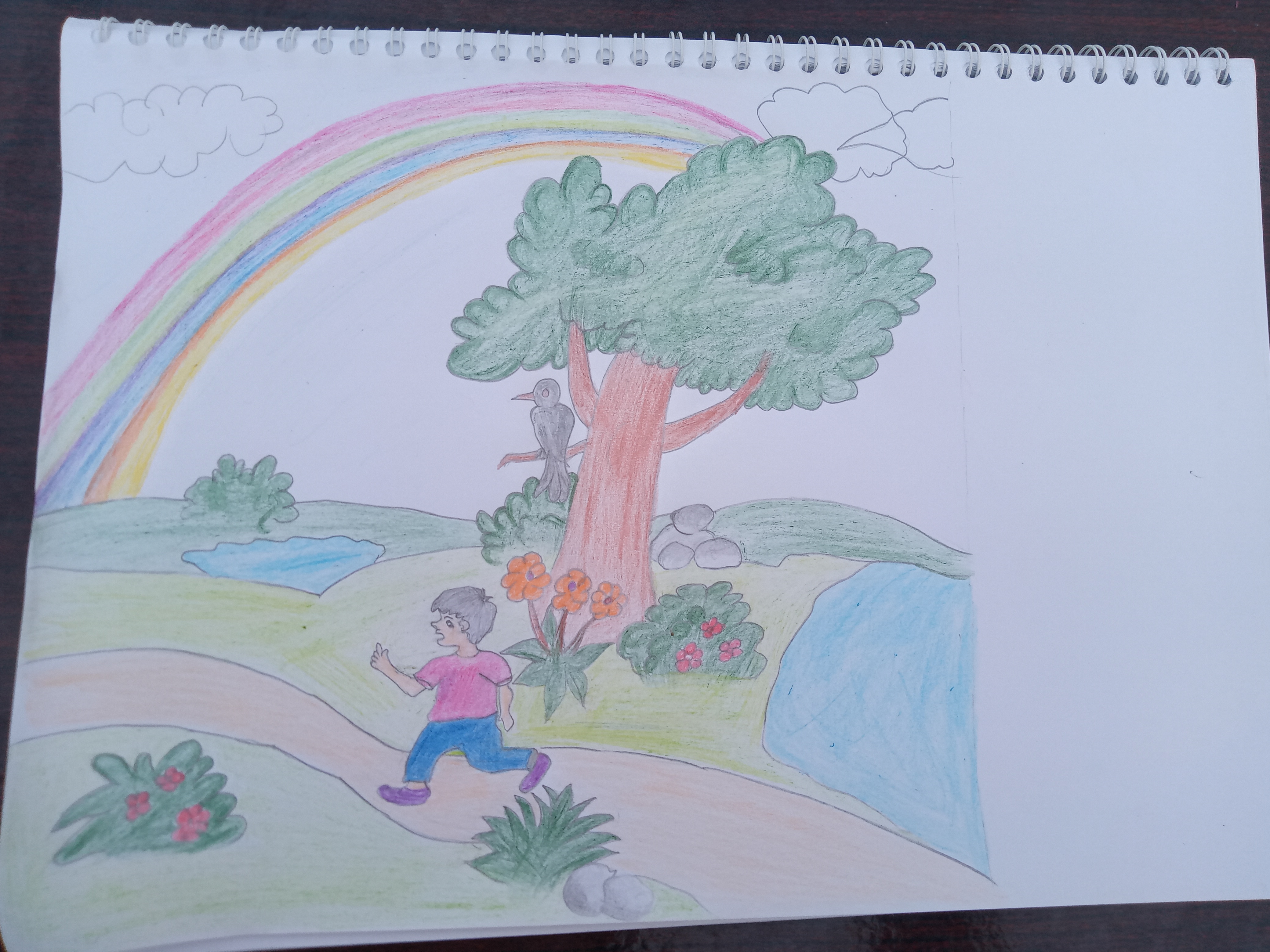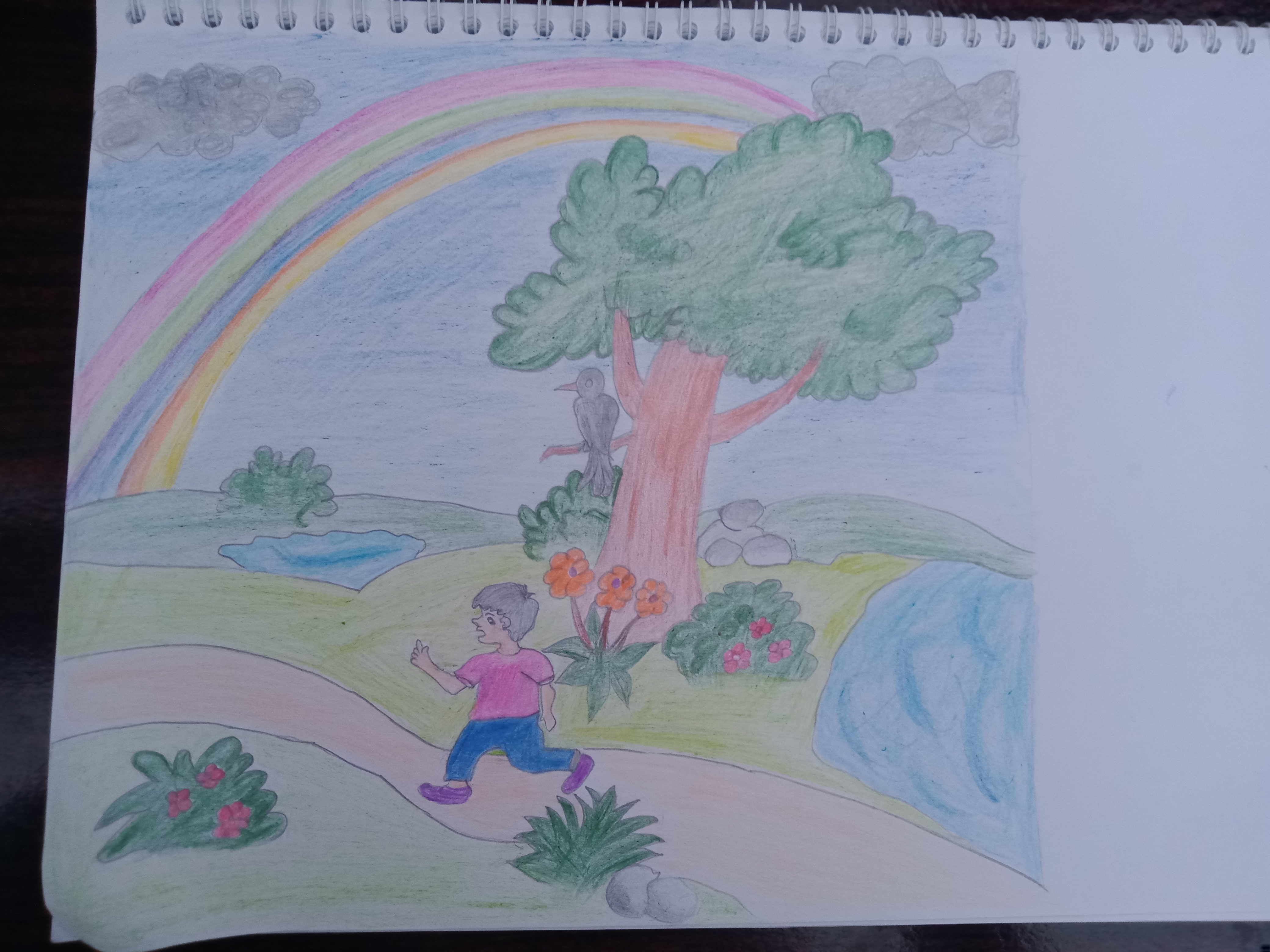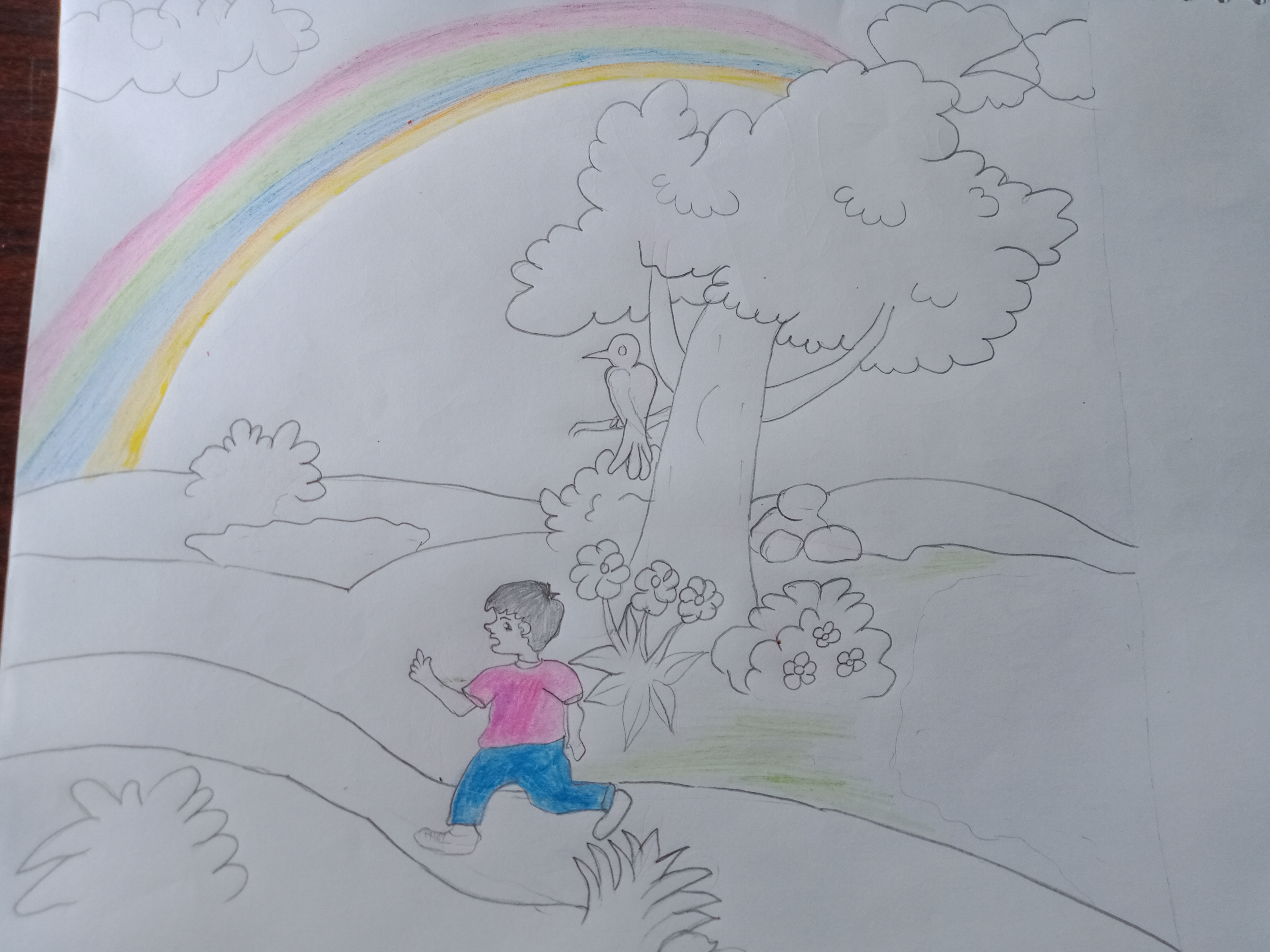 I have drawn basics lines for valley bank, rainbow, grass, clouds and flowers 🌹 💐 plants as showing in picture below 👇