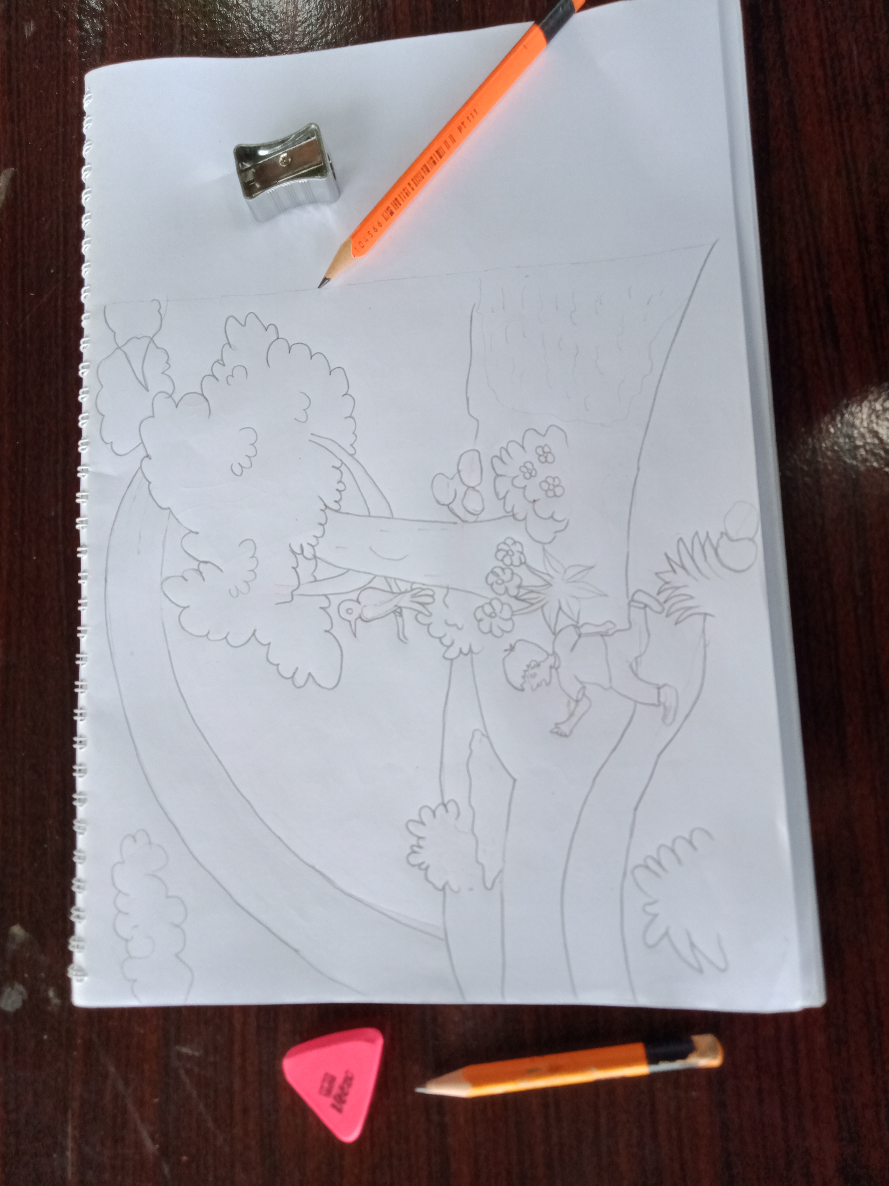 I have got set a white A4 size paper 📜 in portrait layout and start drawing from basic lines of drawing scene with led pencil ✏️. where starting from draw a tree , birds, child, the way and so on ,As you can see in picture.