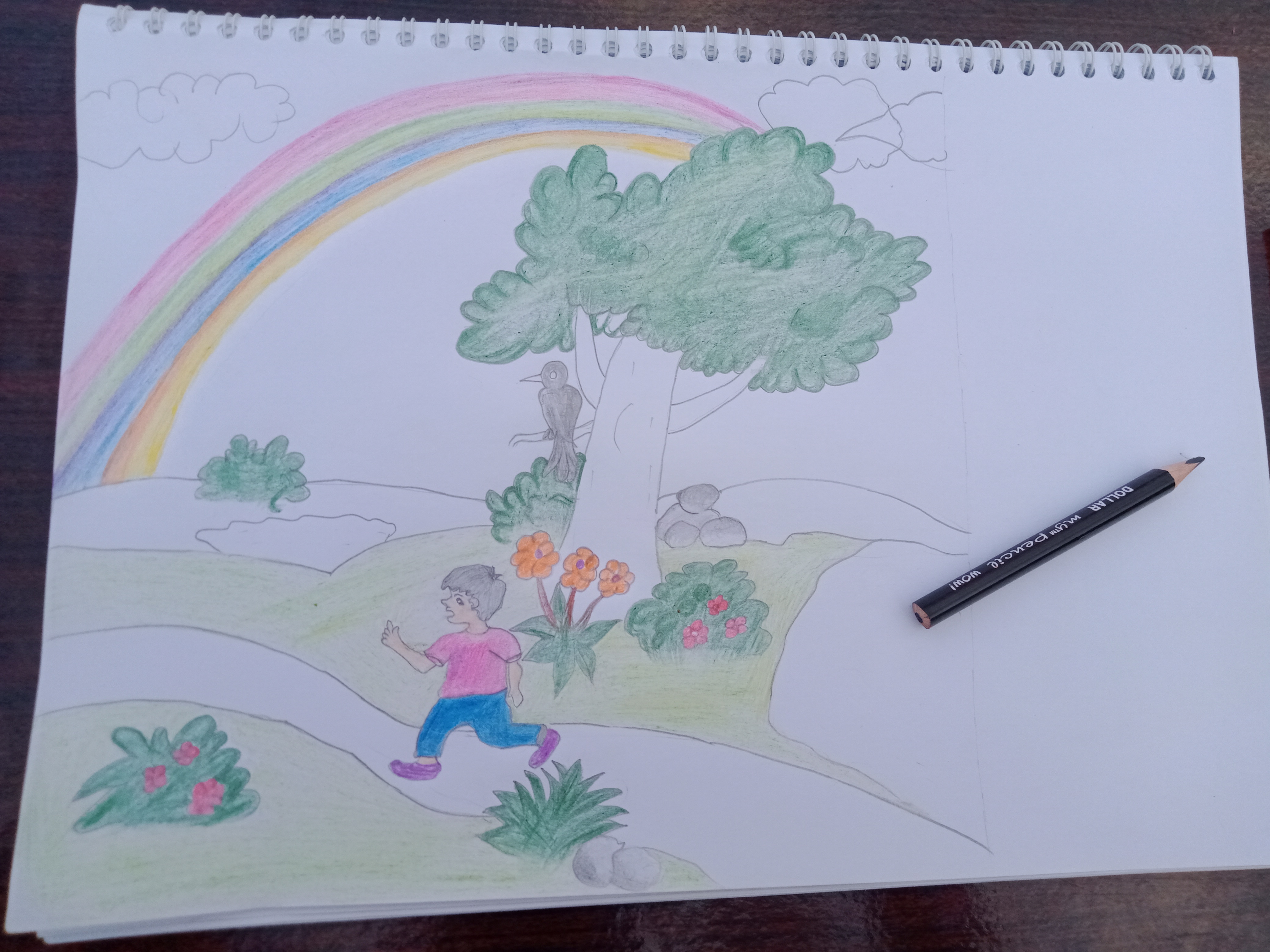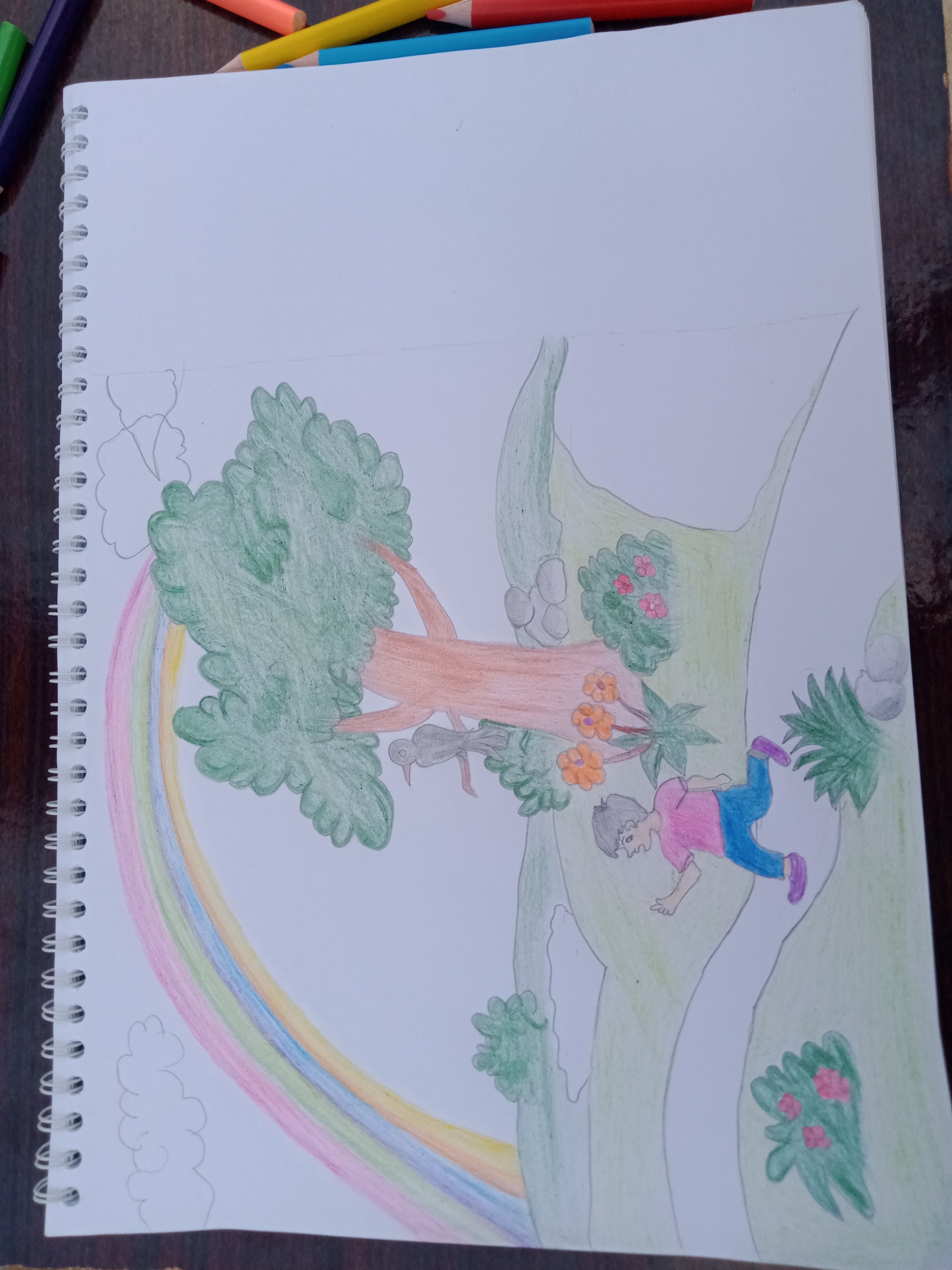 Now I have started filled out the Rainbow colors,child, tree, grass, bird, flowers 🌹 💐 and so on in step three.