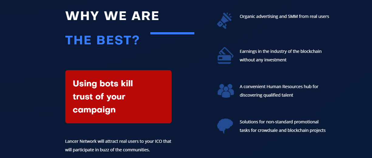 Lancer Network is a project engaged towards assuaging the challenges of effort that new business startups sometimes face as a result of restricted resources offered at their disposal. Communities determine the success of a campaign, especially a campaign to raise funds. By creating a good communication scheme, users can communicate with each other. An active and growing community will increase trust in the project. That is, investment gets support. Ads created by users are more valuable than spam and comments from bots. This strategy can be used effectively to empower the community.