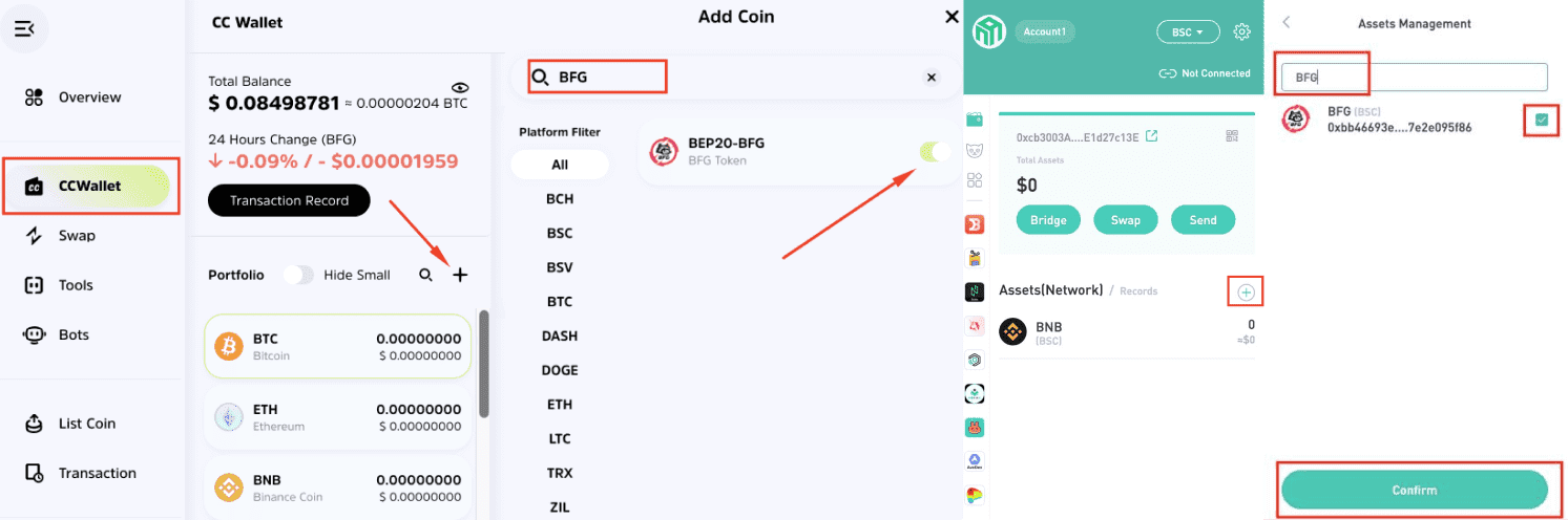 CCTIP Wallet is a custodial Wallet with a huge selection of networks. The company's technologies aim to become the link between Web 2.0 and Web 3.0 in the future. Since CCWallet supports many blockchains on a single platform, it is an excellent choice for those trying to reduce high withdrawal fees. To add BFG to the CC Wallet, select "+”, enter BFG in the search box, and switch the mode to “On”.