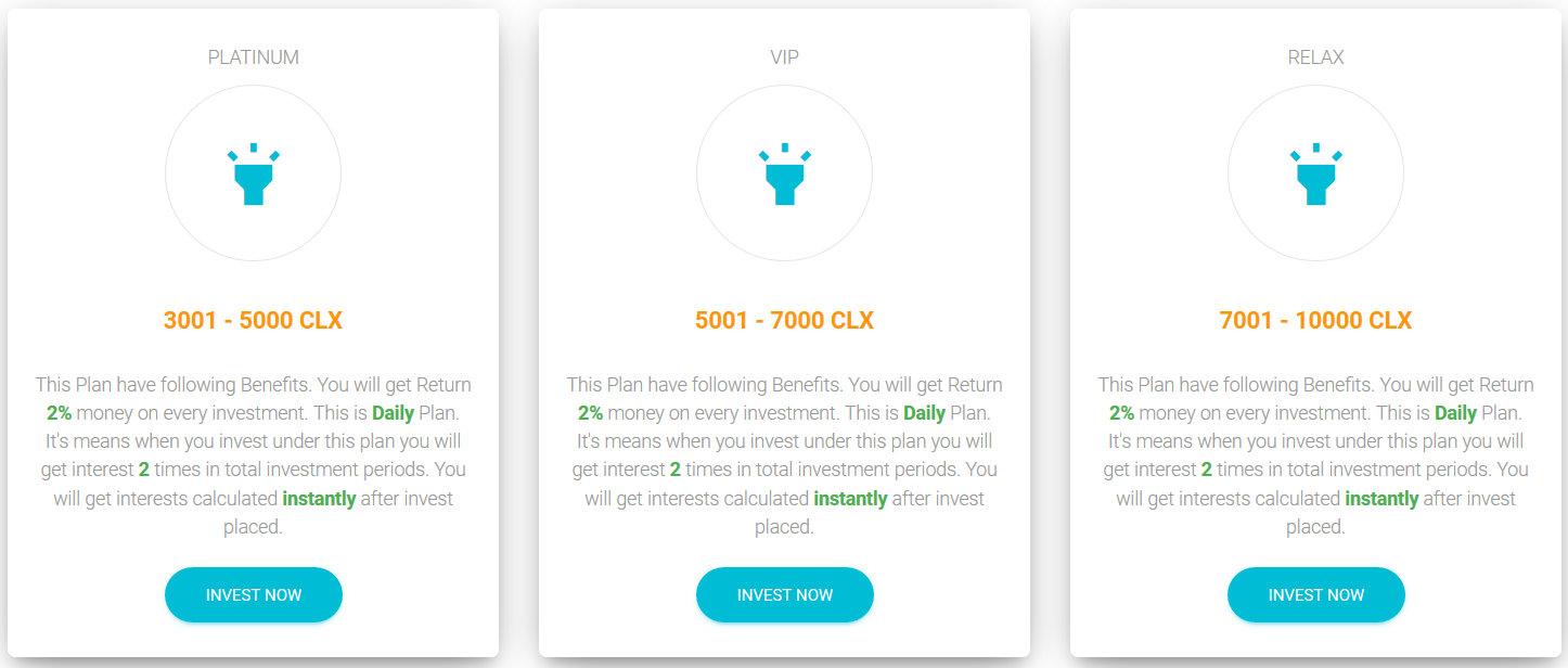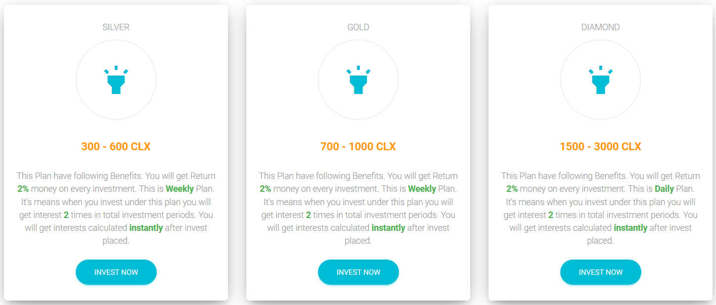 Currently, members can earn approximately 14CLX a day with an additional 10% of the PTC earnings from each referred member. The minimum withdrawal is 350CLX. On top of the usual PTC offerings, CoinClix also offers "Investment Plans" where members can choose to "invest" their CLX for 24 hours or a week for a 2% return on their "investment".