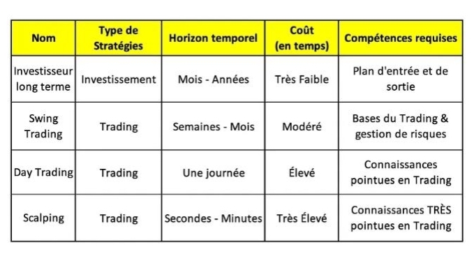 Les traders sont des investisseurs qui spéculent sur la volatilité à court terme. Ils savent prendre des décisions rapidement, gèrent bien la pression et ont un goût prononcé pour le risque. Les meilleurs traders gagnent de l'argent dans les 2 sens du marché : acheter bas et revendre haut (position longue) et vendre haut et racheter bas (position short). Un trader utilise l'analyse technique, dispose de compétences graphiques pointues et détermine avant chaque trade un point d'entrée, de sortie (= stop-loss) et de prises de profits (= take-profit). Pour être rentable sur la durée, un trader scrute 2 variables: le ratio de trades gagnants/perdants et le ratio de gains/pertes de capital. Si un trader a un ratio de trades gagnants/perdants inférieur à 1, ce n'est pas bon. En revanche, dans cette configuration il peut tout de même être profitable. Par exemple, il gagne 40% de ses trades donc en perd 60% (ratio < 1). S'il met des stop-loss (= ordre de vente pour couper les pertes) proches de ses point d'entrée, il minimise ses pertes. Donc, s'il perd 60% de ses trades avec une perte moyenne de 3% par trade et qu'il gagne en movenne 20% par trade sur les 40% de ses trades gagnants, il est rentable. Donc, l'idéal est de gagner plus de trades qu'on en perd avec des pertes faibles et des gains supérieurs aux pertes.